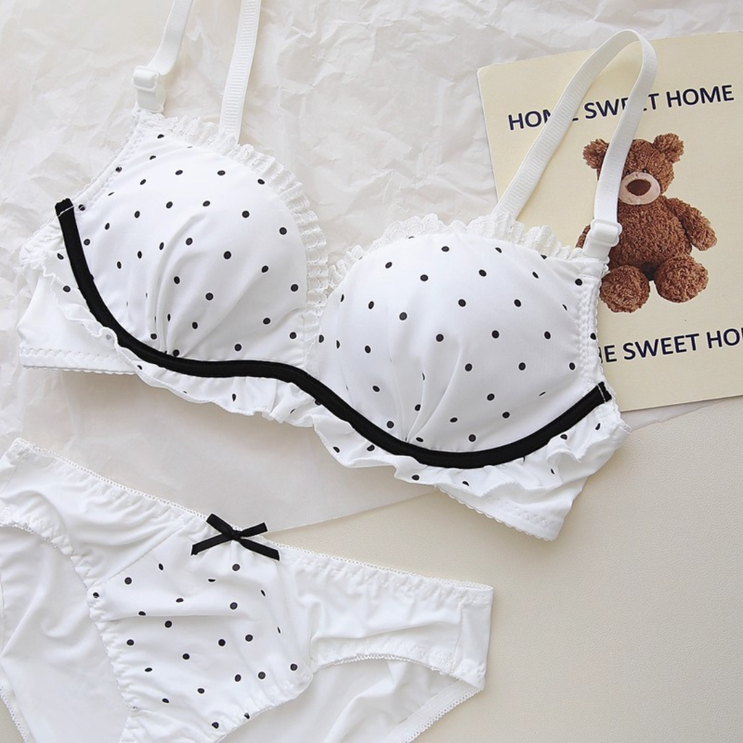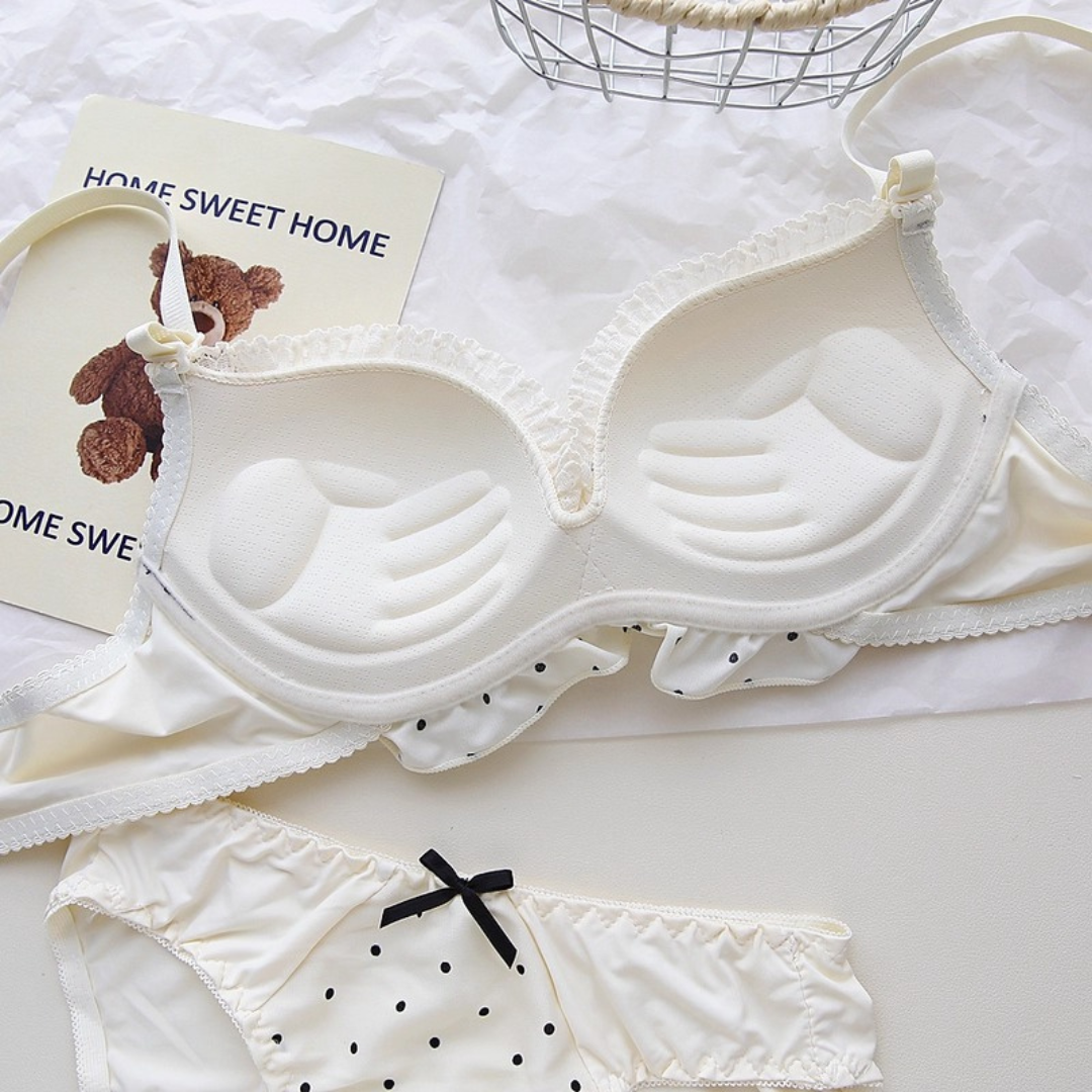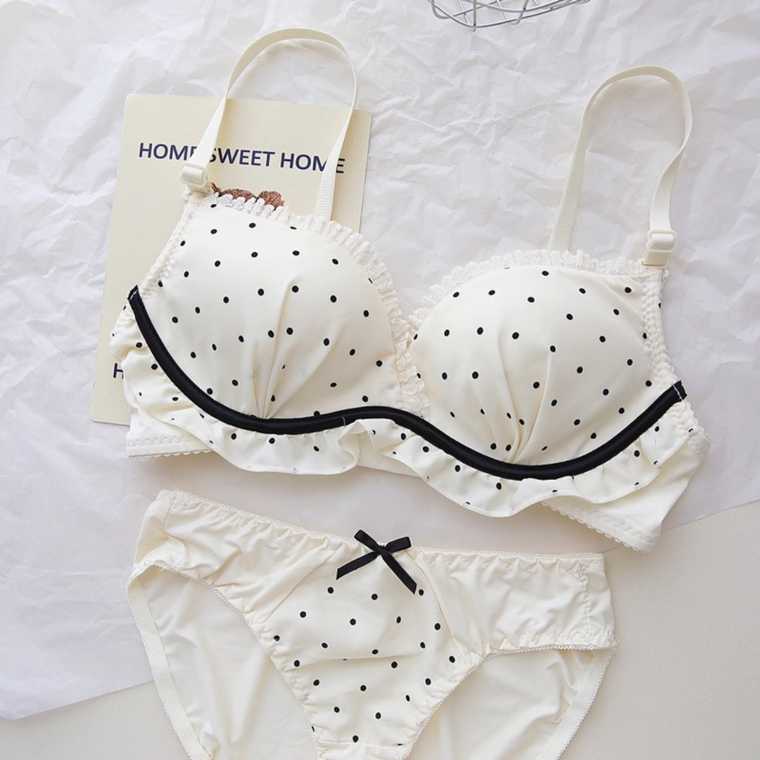 ふんわりフリルとドット柄がガーリーな印象のランジェリーセット。内側の「手のひら型パッド」が小胸さんでもしっかり寄せて自然なボリュームを演出!デイリーにもリラックスタイムにもぴったり。