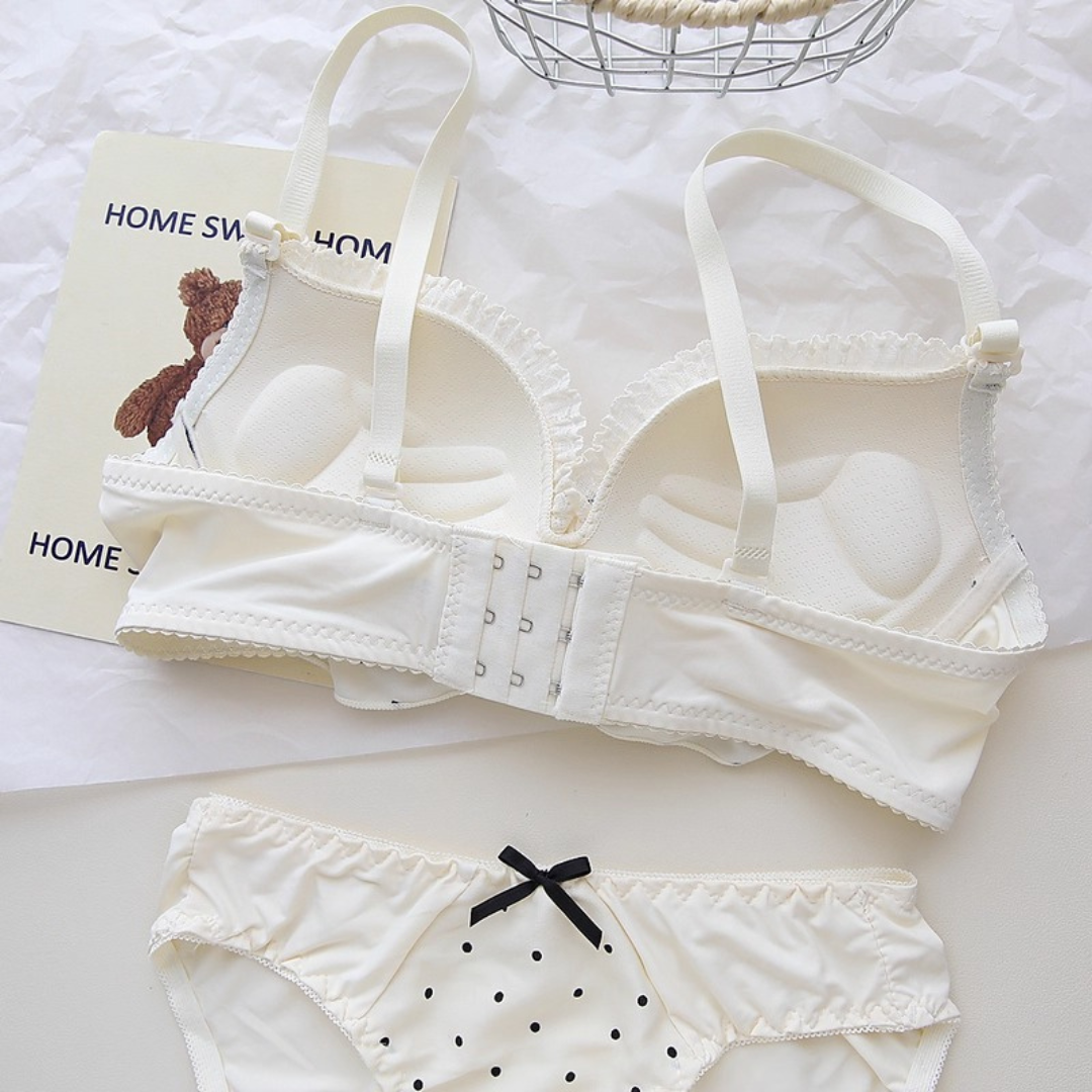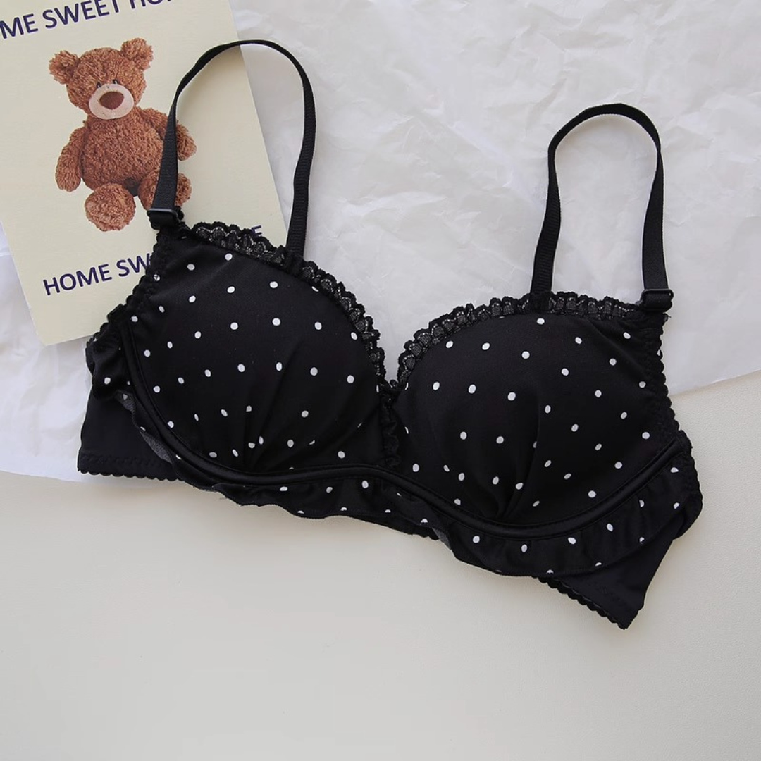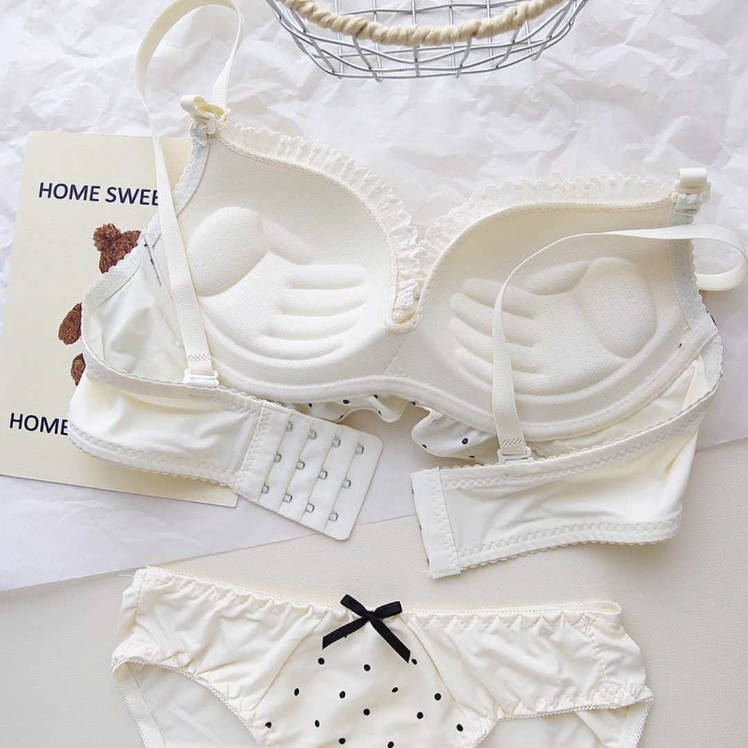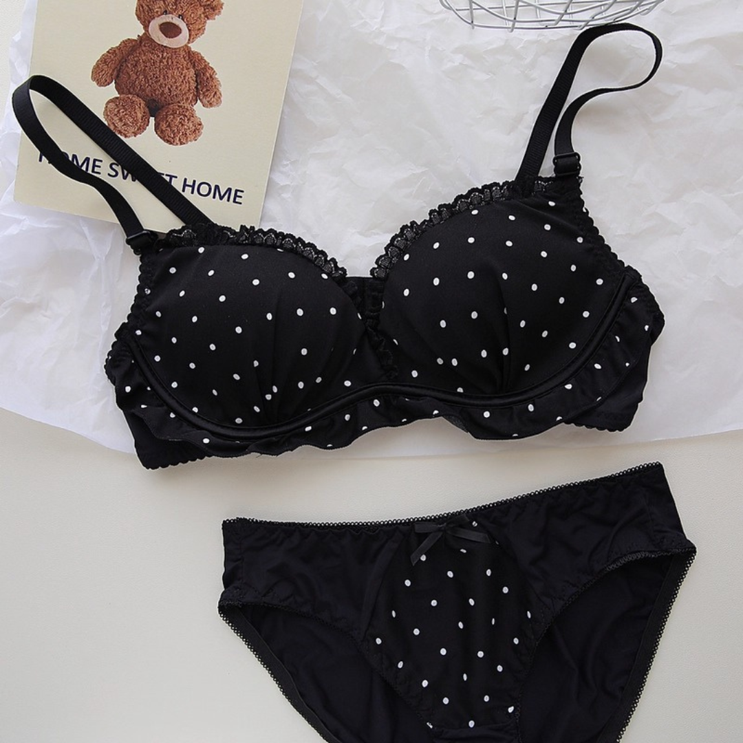 ふんわりフリルとドット柄がガーリーな印象のランジェリーセット。内側の「手のひら型パッド」が小胸さんでもしっかり寄せて自然なボリュームを演出!デイリーにもリラックスタイムにもぴったり。