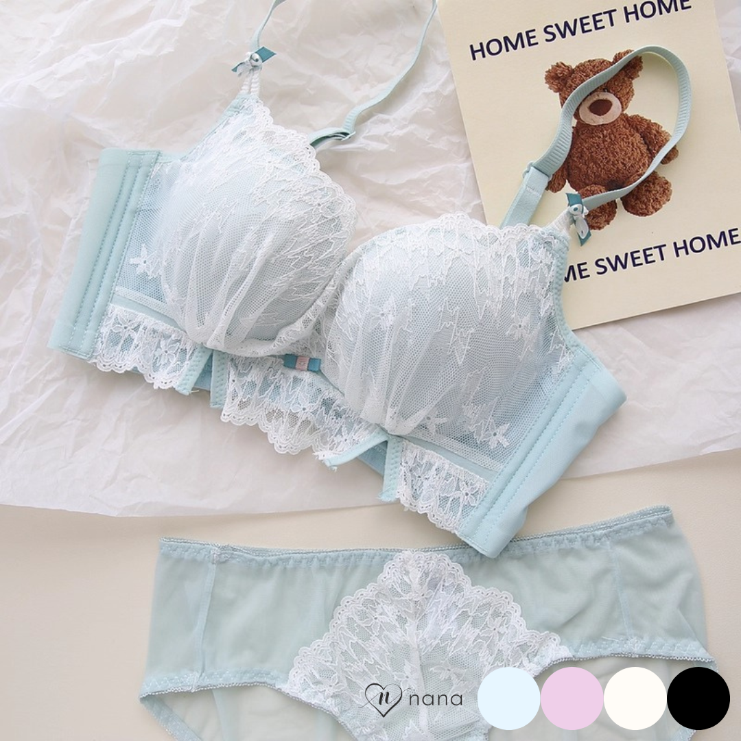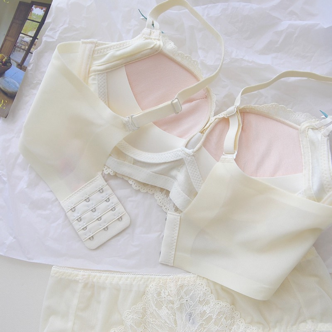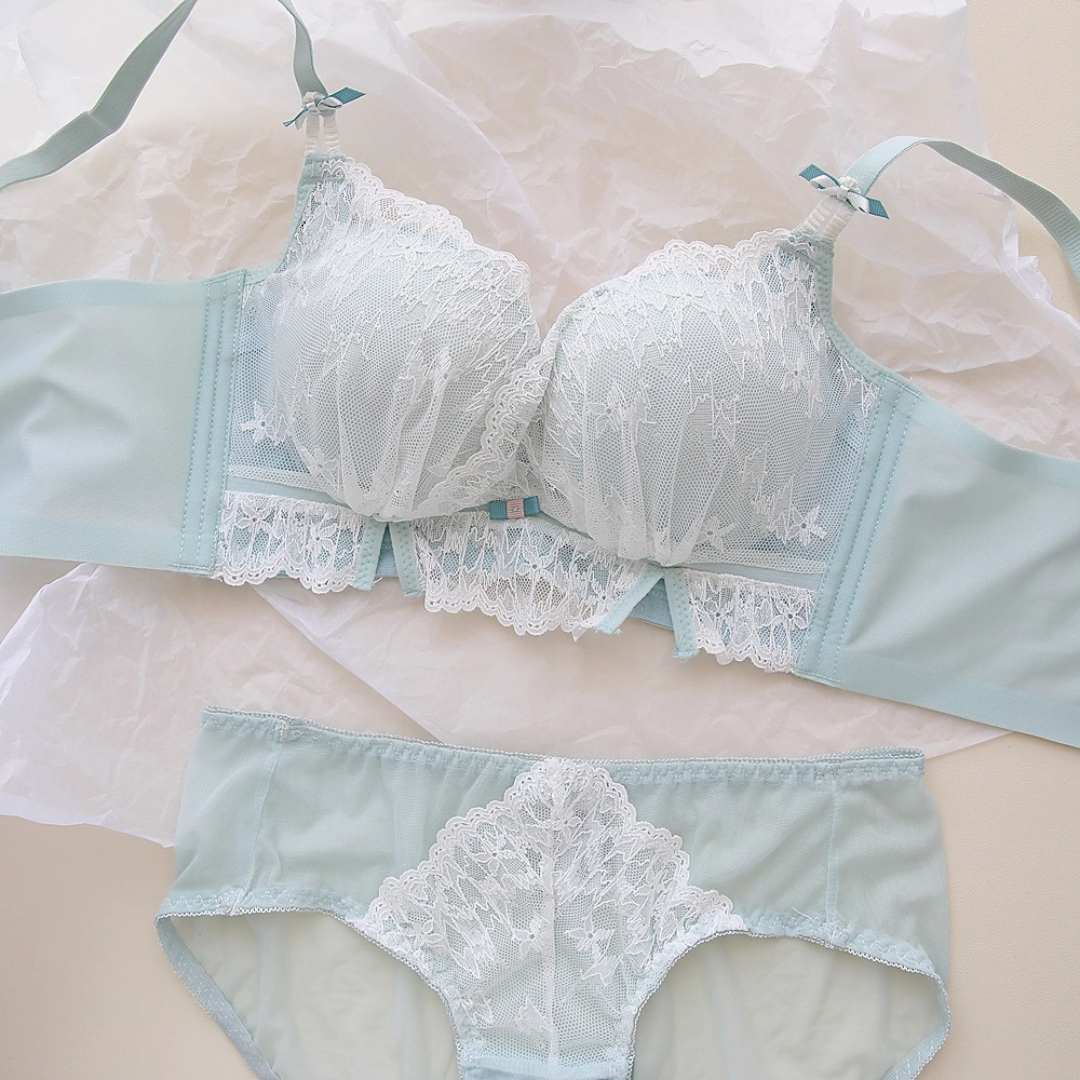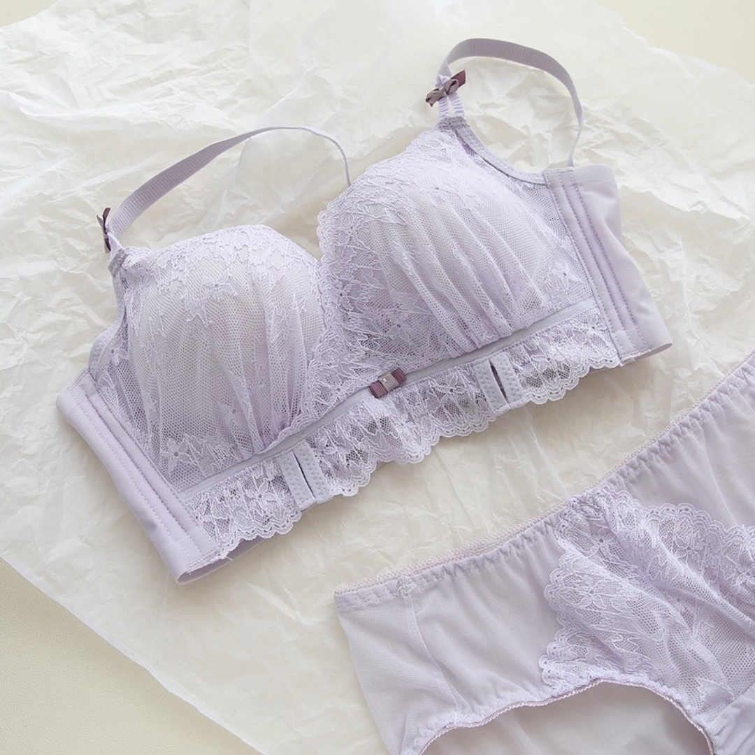 軽やかなレースと上品なカラーが織りなす、プリンセスのように優雅なランジェリーセット。小胸さんにも嬉しい自然な谷間メイク効果と、脇高構造のサポートで副乳をすっきり整える設計です。どの角度から見ても女性らしさを引き立て、毎日の自分をもっと好きになれる一着♡