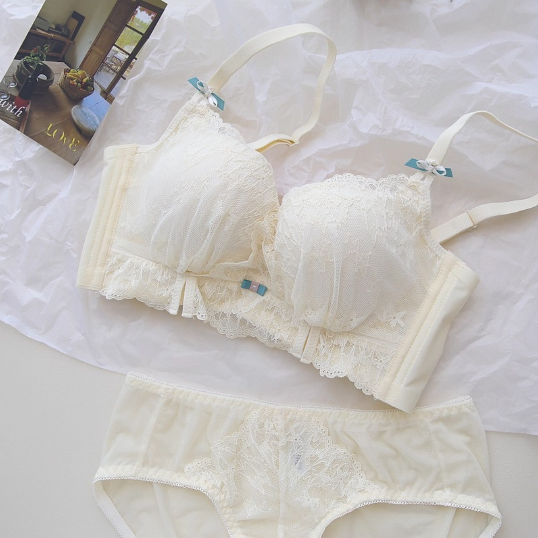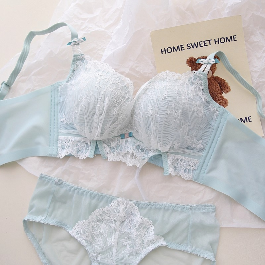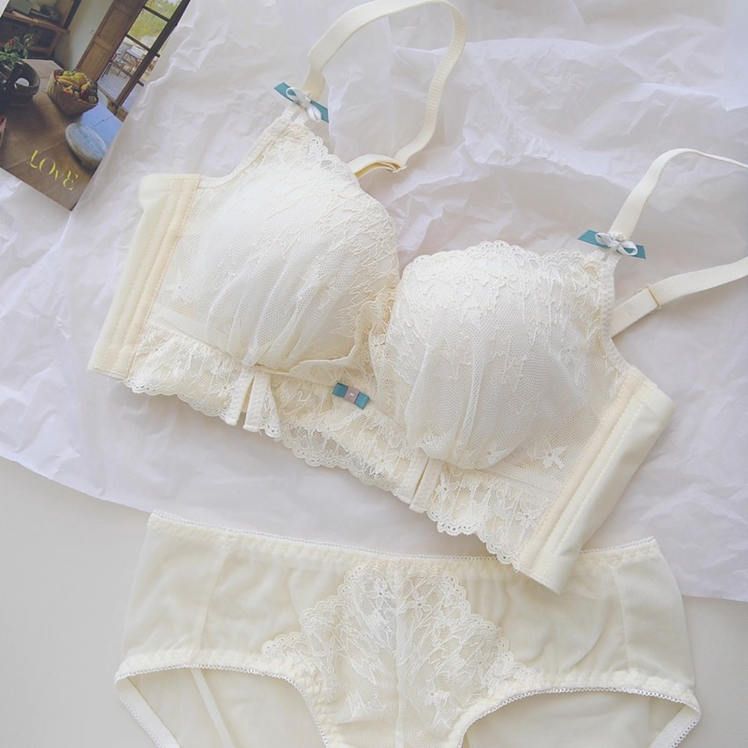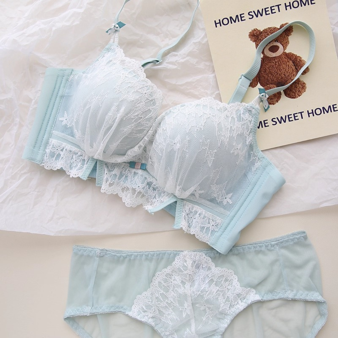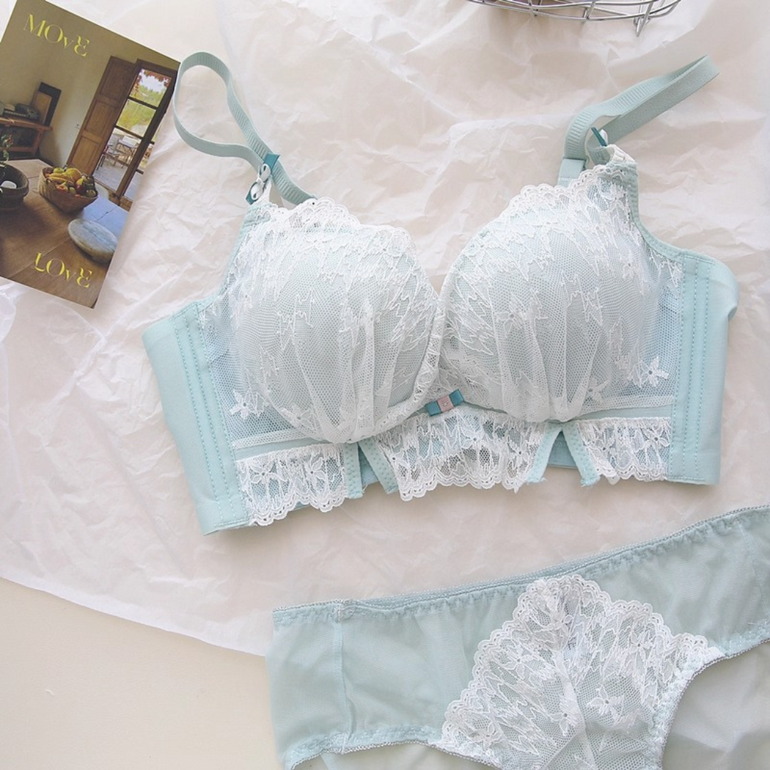 軽やかなレースと上品なカラーが織りなす、プリンセスのように優雅なランジェリーセット。小胸さんにも嬉しい自然な谷間メイク効果と、脇高構造のサポートで副乳をすっきり整える設計です。どの角度から見ても女性らしさを引き立て、毎日の自分をもっと好きになれる一着♡