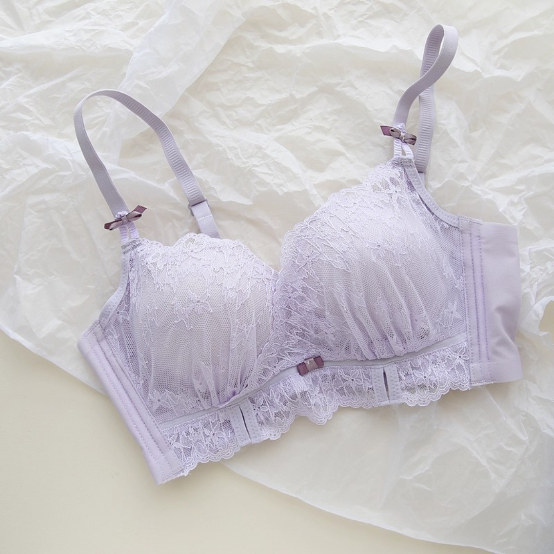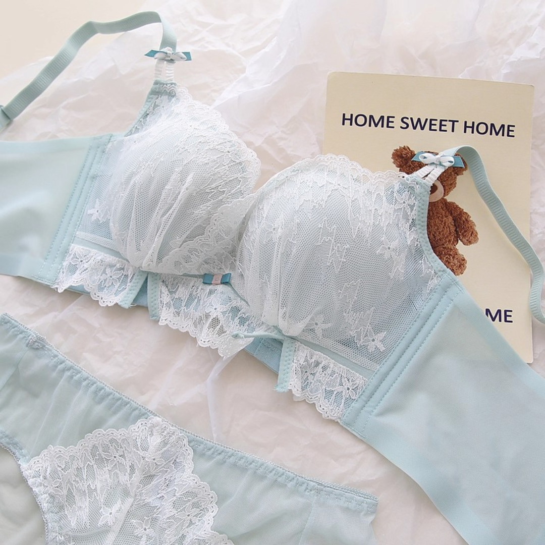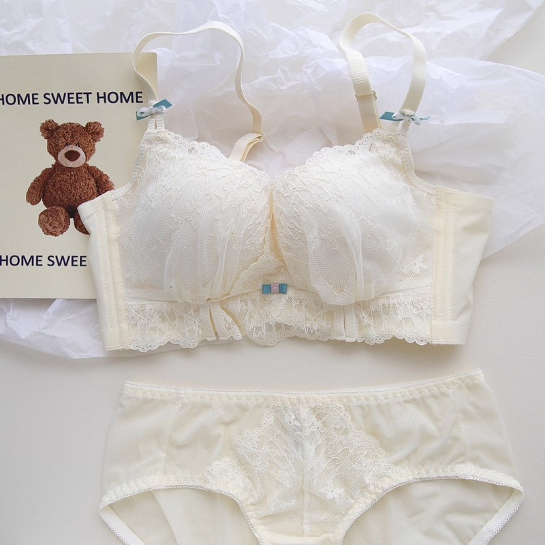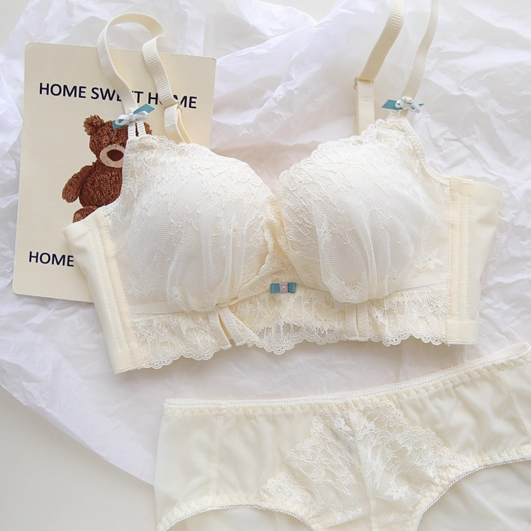 軽やかなレースと上品なカラーが織りなす、プリンセスのように優雅なランジェリーセット。小胸さんにも嬉しい自然な谷間メイク効果と、脇高構造のサポートで副乳をすっきり整える設計です。どの角度から見ても女性らしさを引き立て、毎日の自分をもっと好きになれる一着♡
