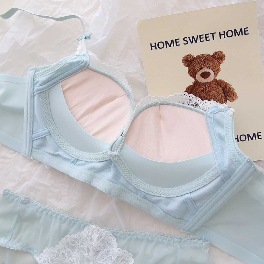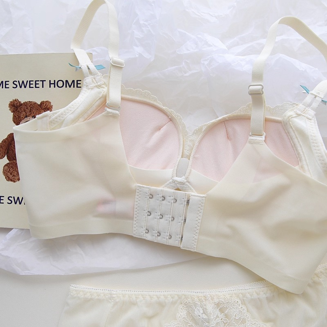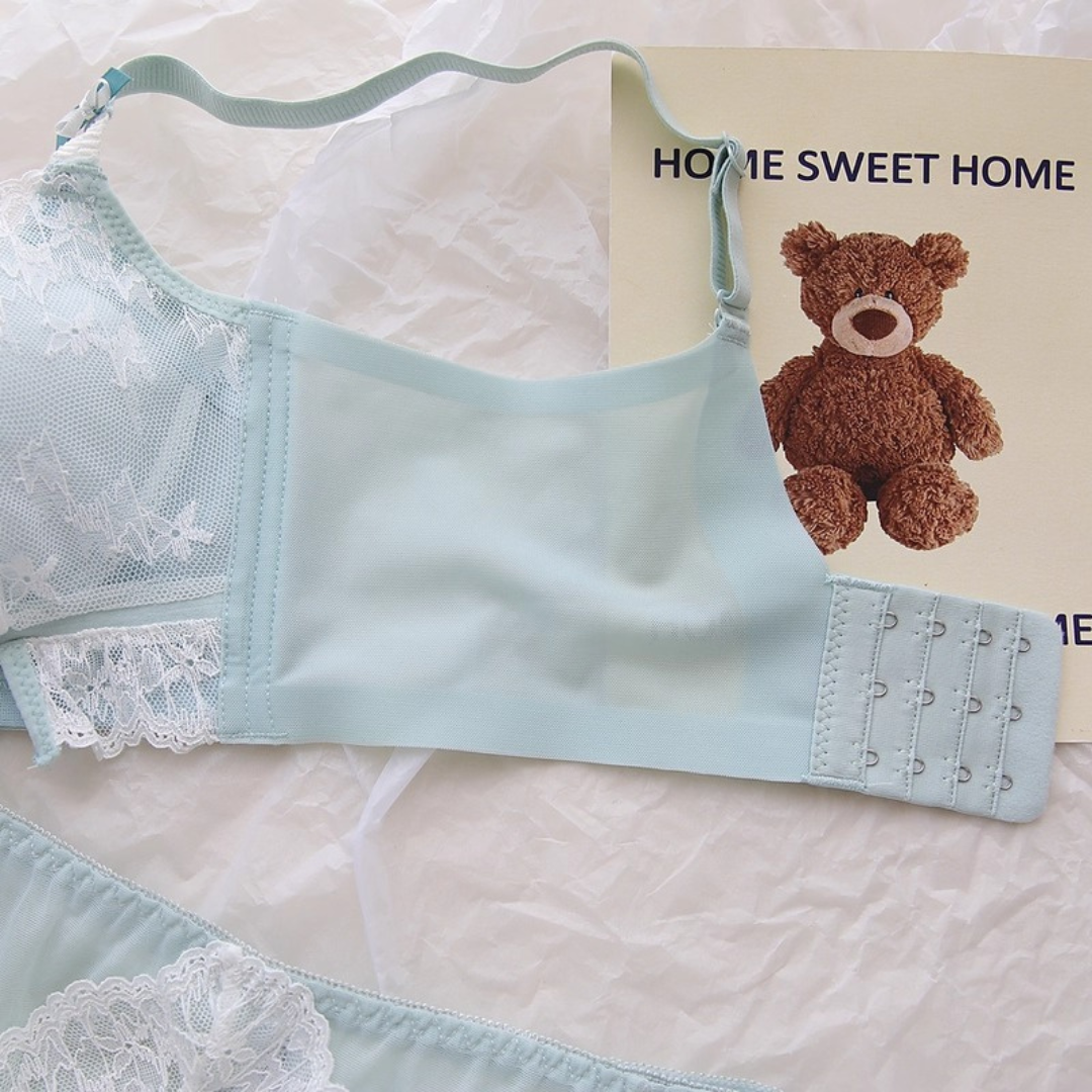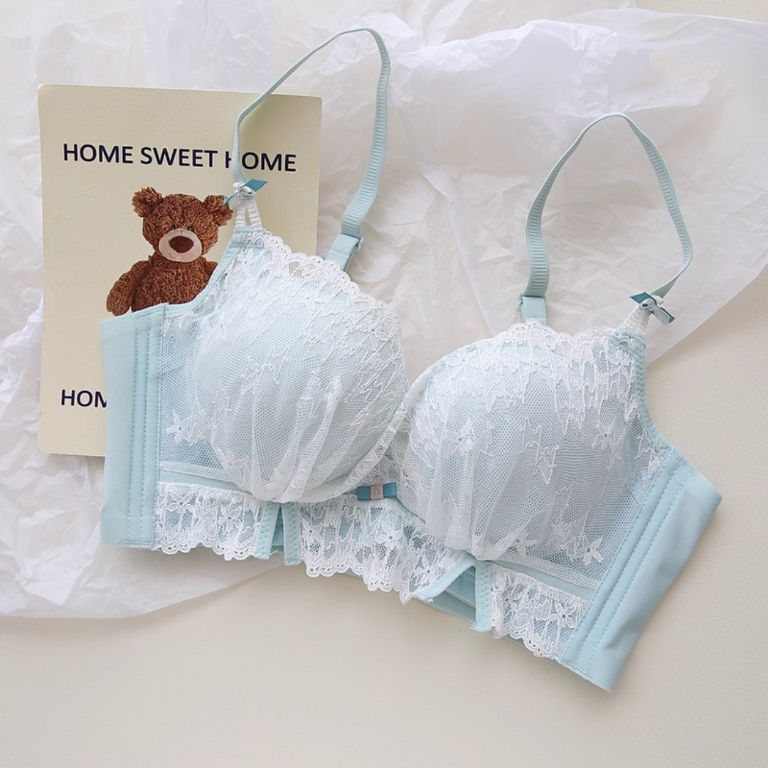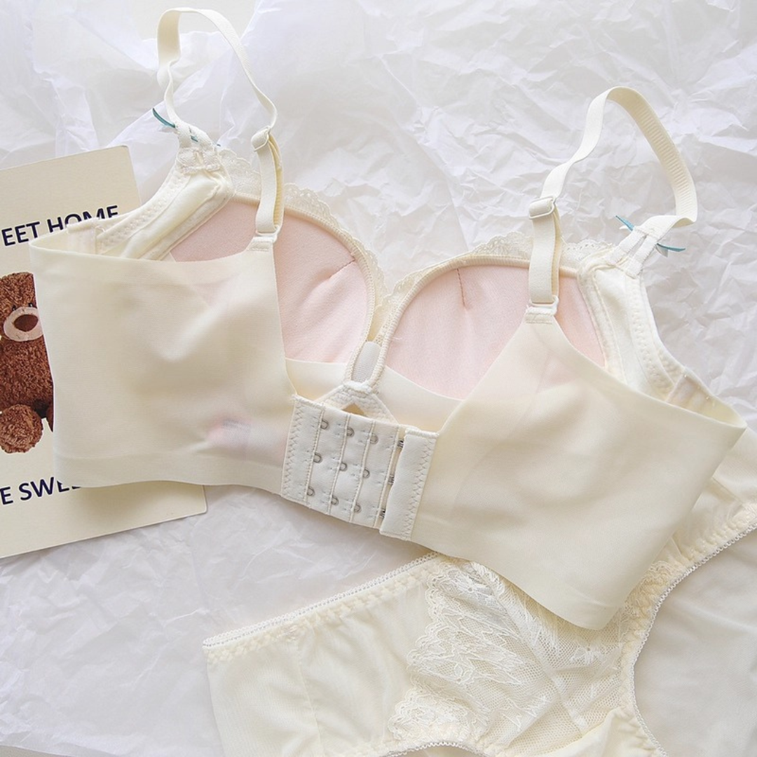 軽やかなレースと上品なカラーが織りなす、プリンセスのように優雅なランジェリーセット。小胸さんにも嬉しい自然な谷間メイク効果と、脇高構造のサポートで副乳をすっきり整える設計です。どの角度から見ても女性らしさを引き立て、毎日の自分をもっと好きになれる一着♡