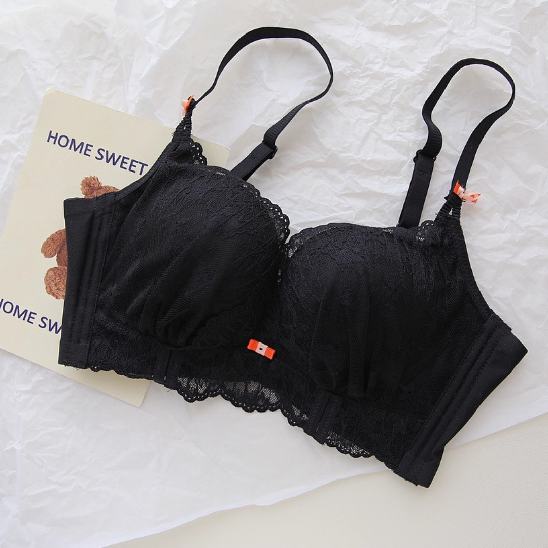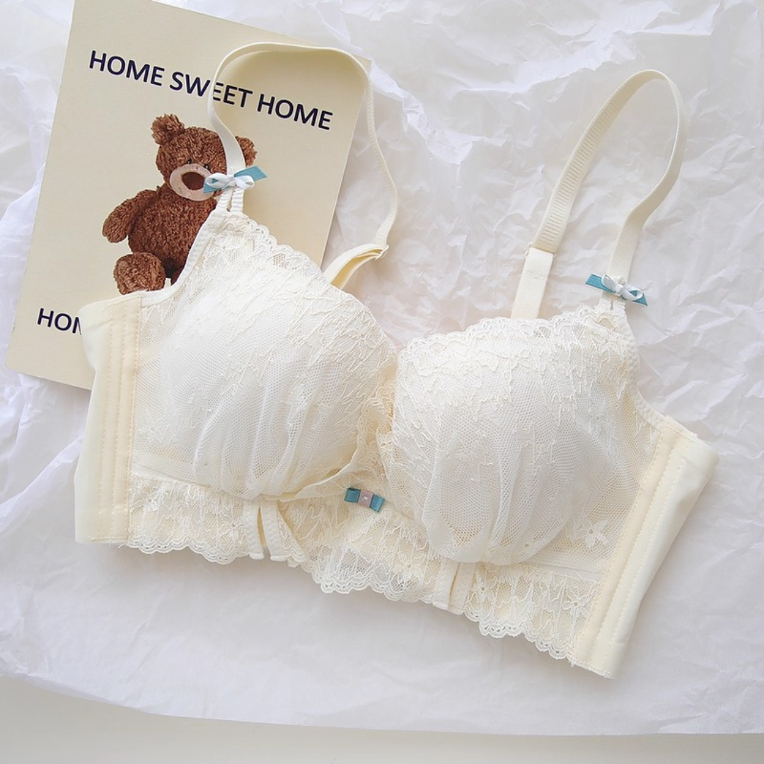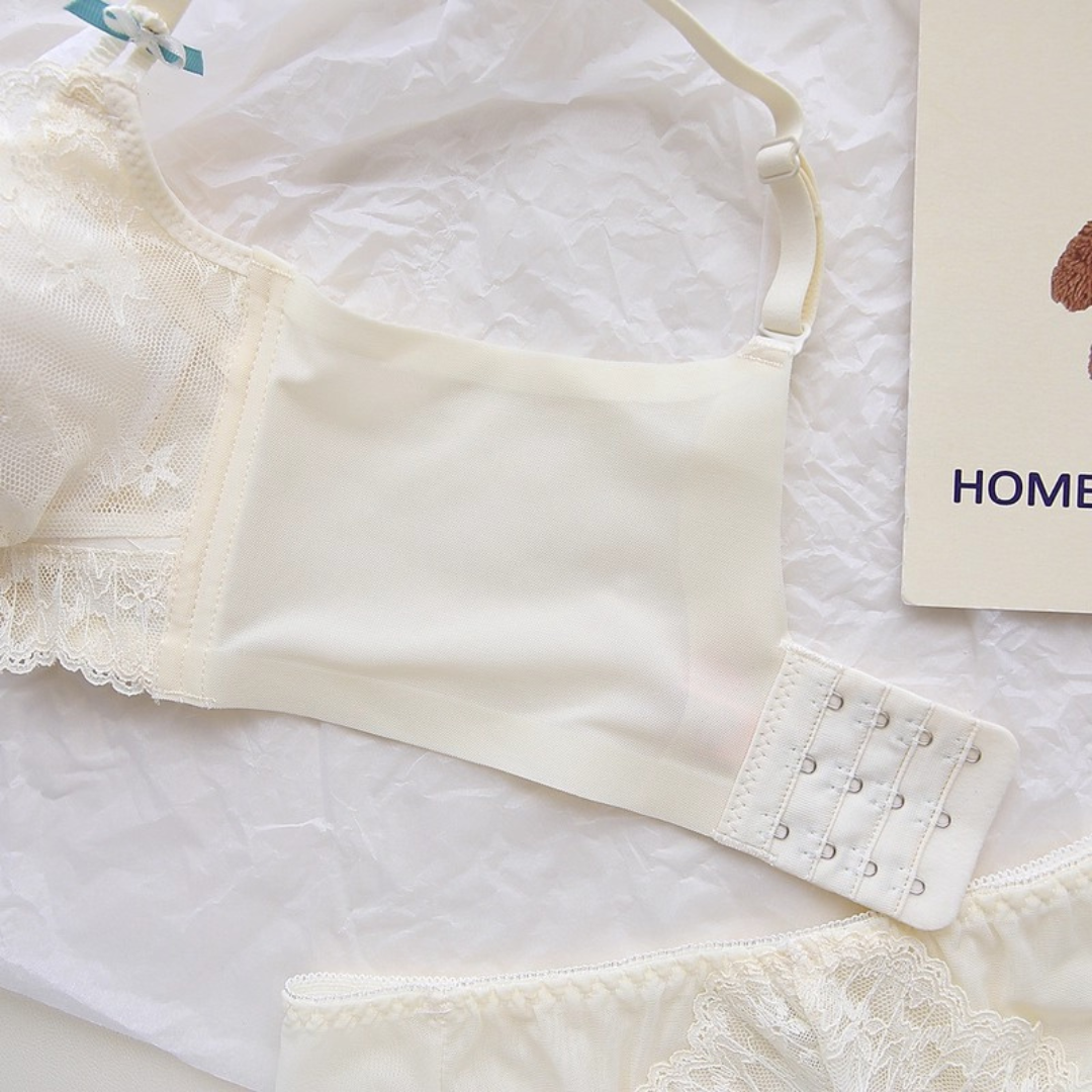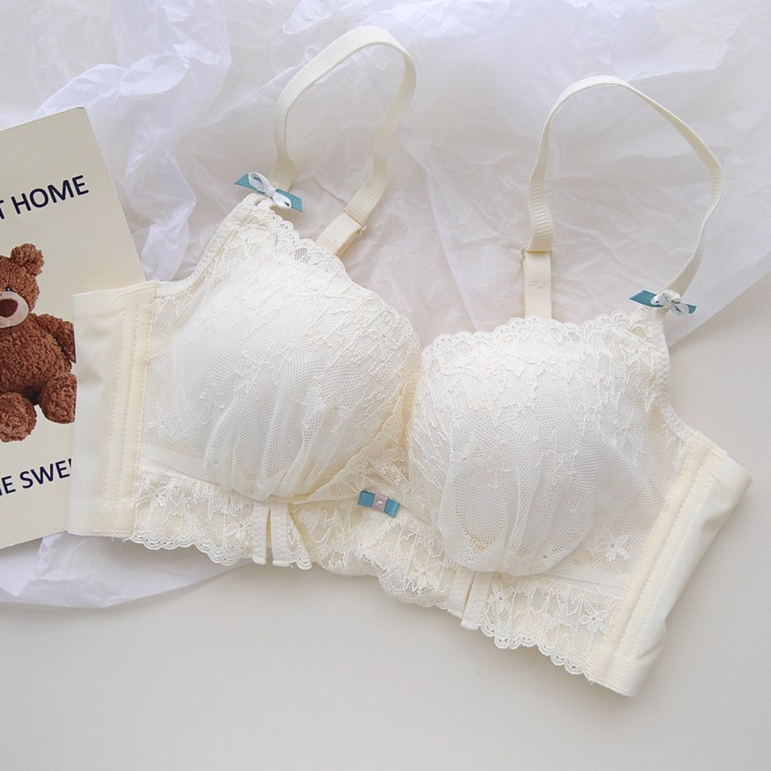 軽やかなレースと上品なカラーが織りなす、プリンセスのように優雅なランジェリーセット。小胸さんにも嬉しい自然な谷間メイク効果と、脇高構造のサポートで副乳をすっきり整える設計です。どの角度から見ても女性らしさを引き立て、毎日の自分をもっと好きになれる一着♡