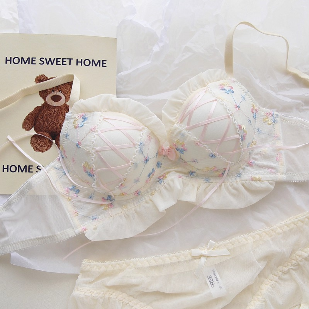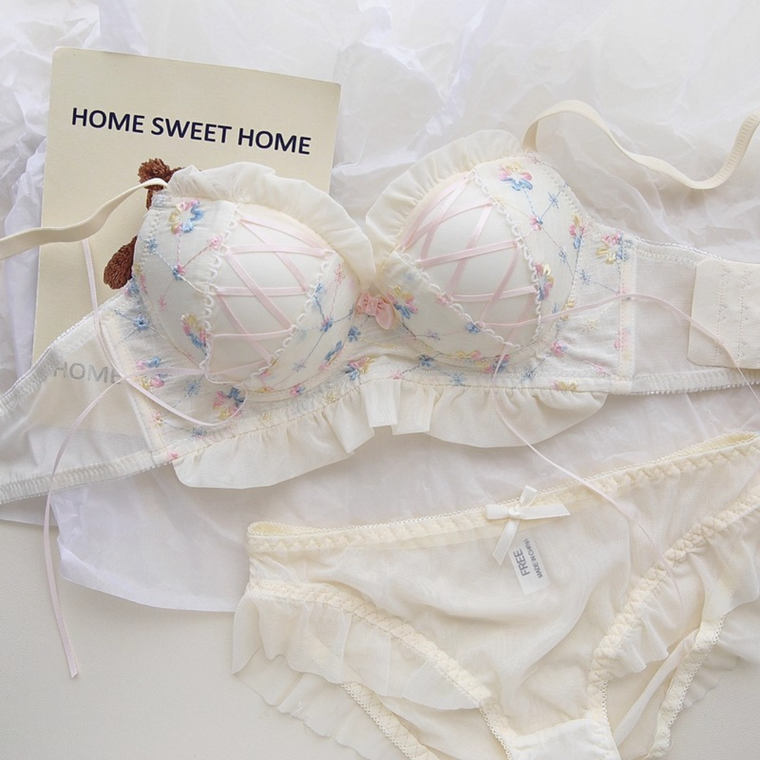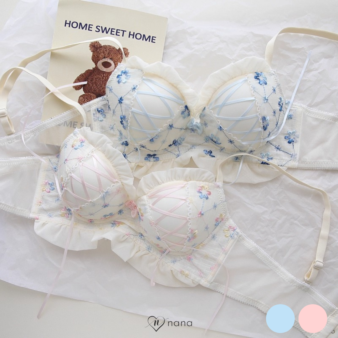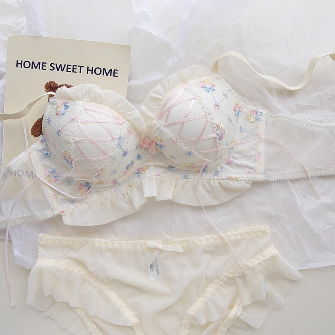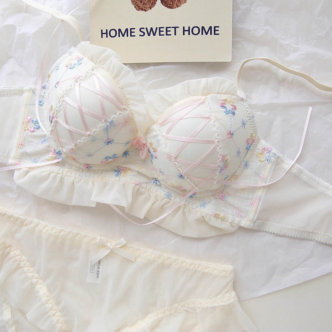やさしい色合いと繊細な花刺繍が乙女心をくすぐるブラ&ショーツセット。ふんわりしたチュールフリルと、クロスリボンのアクセントがポイント!おうちでもお出かけ前でも、気分を上げてくれるスウィートデザインです。