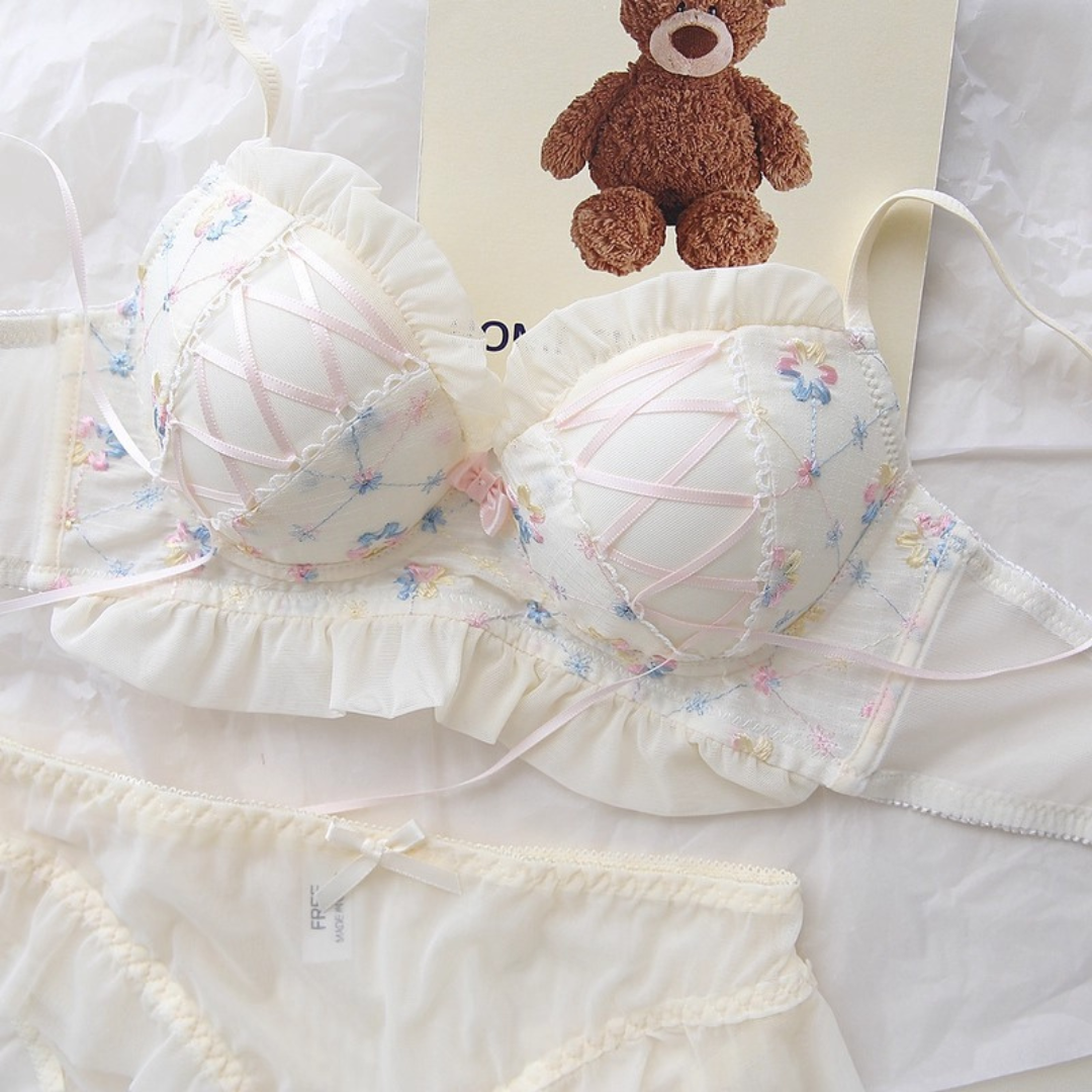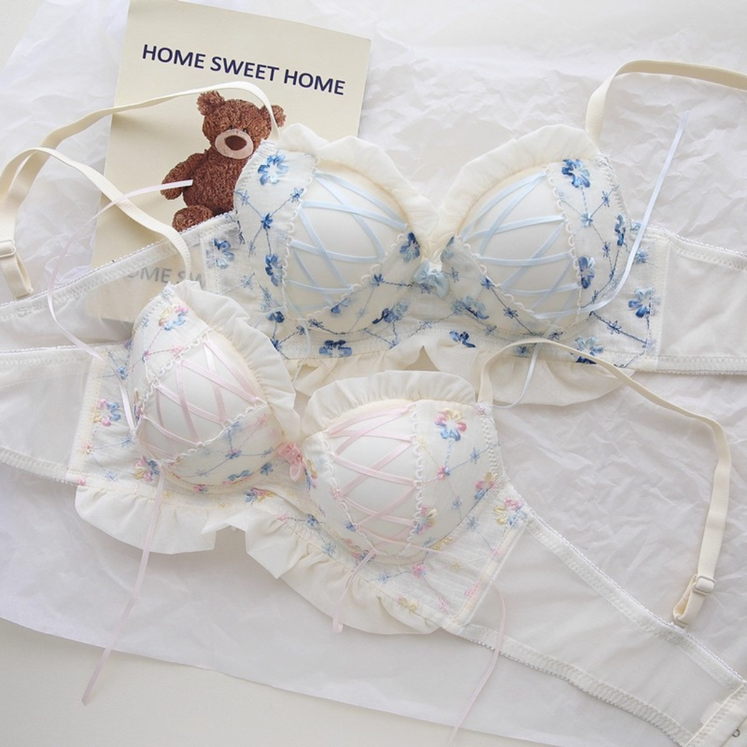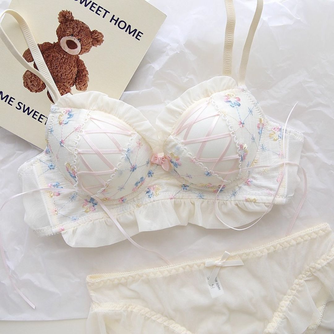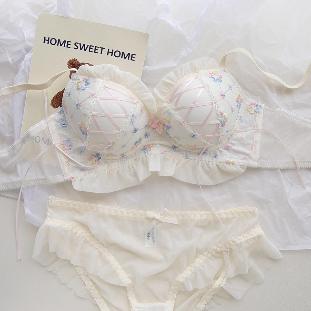 やさしい色合いと繊細な花刺繍が乙女心をくすぐるブラ&ショーツセット。ふんわりしたチュールフリルと、クロスリボンのアクセントがポイント!おうちでもお出かけ前でも、気分を上げてくれるスウィートデザインです。