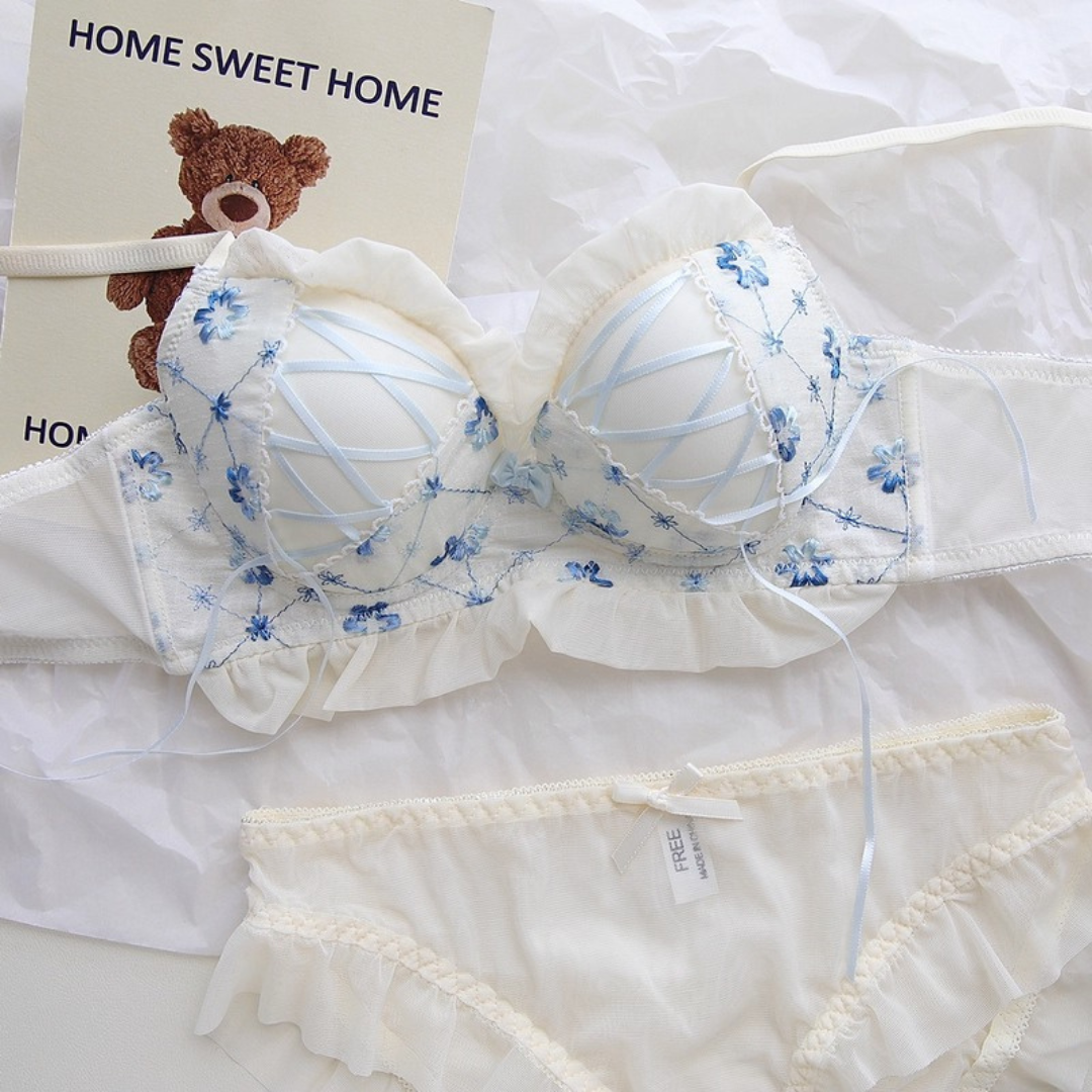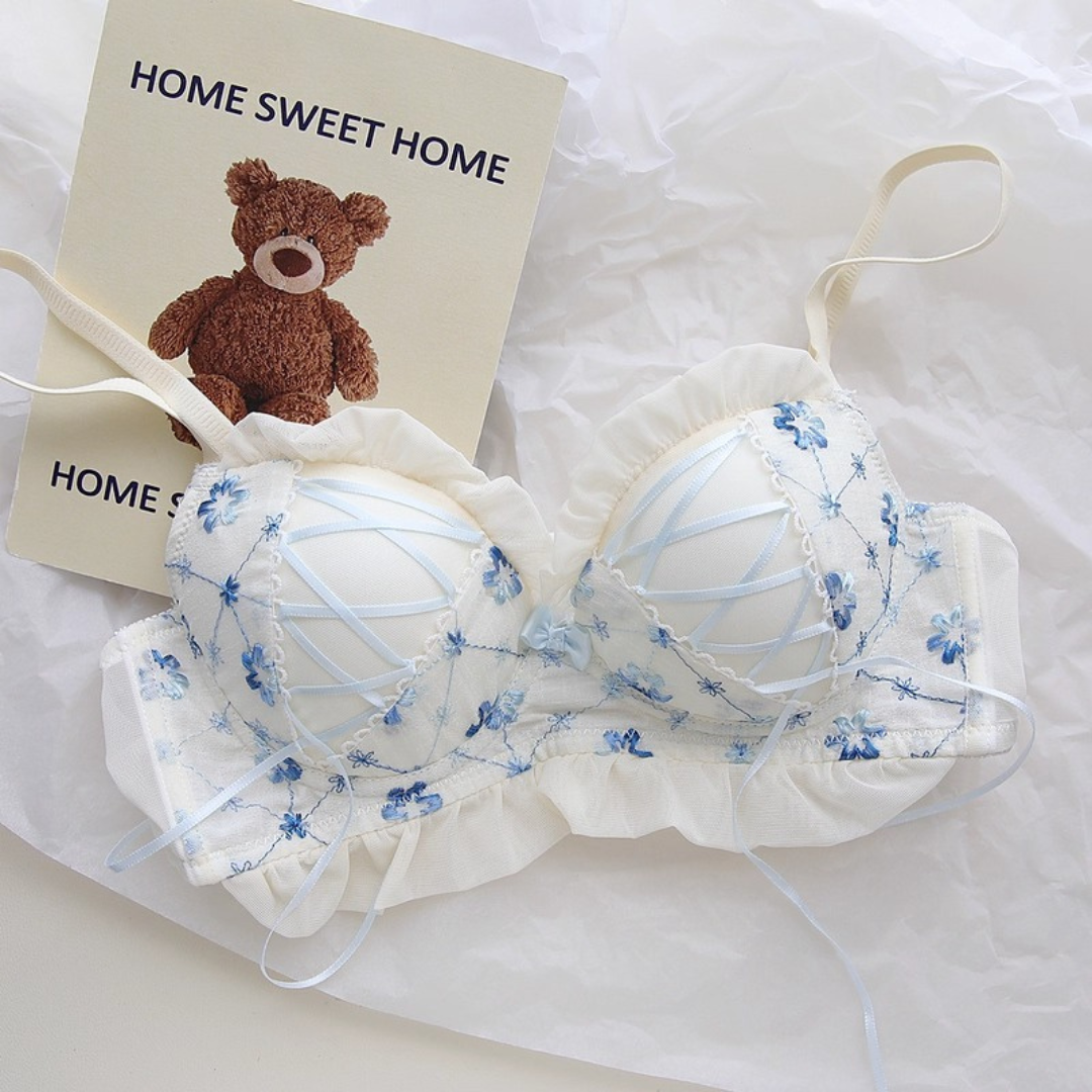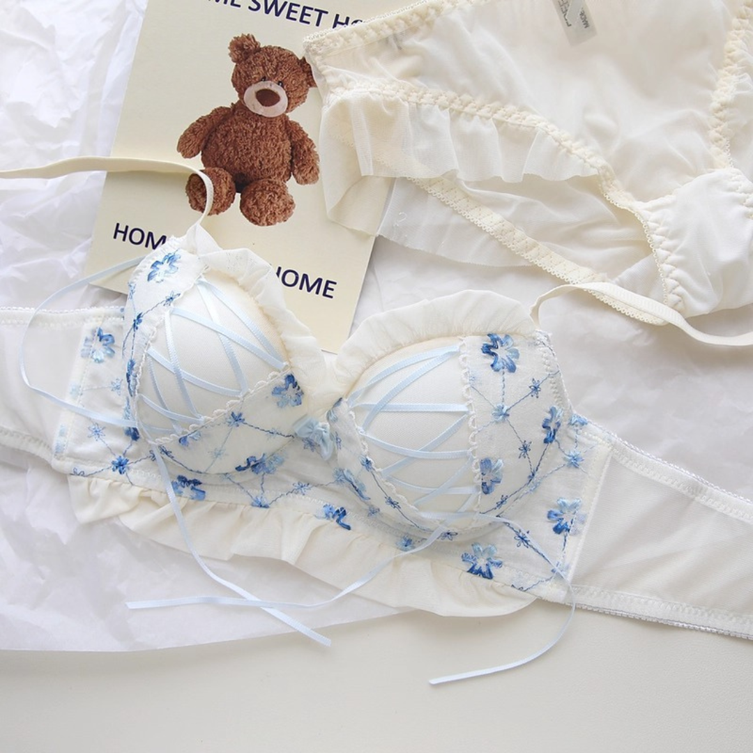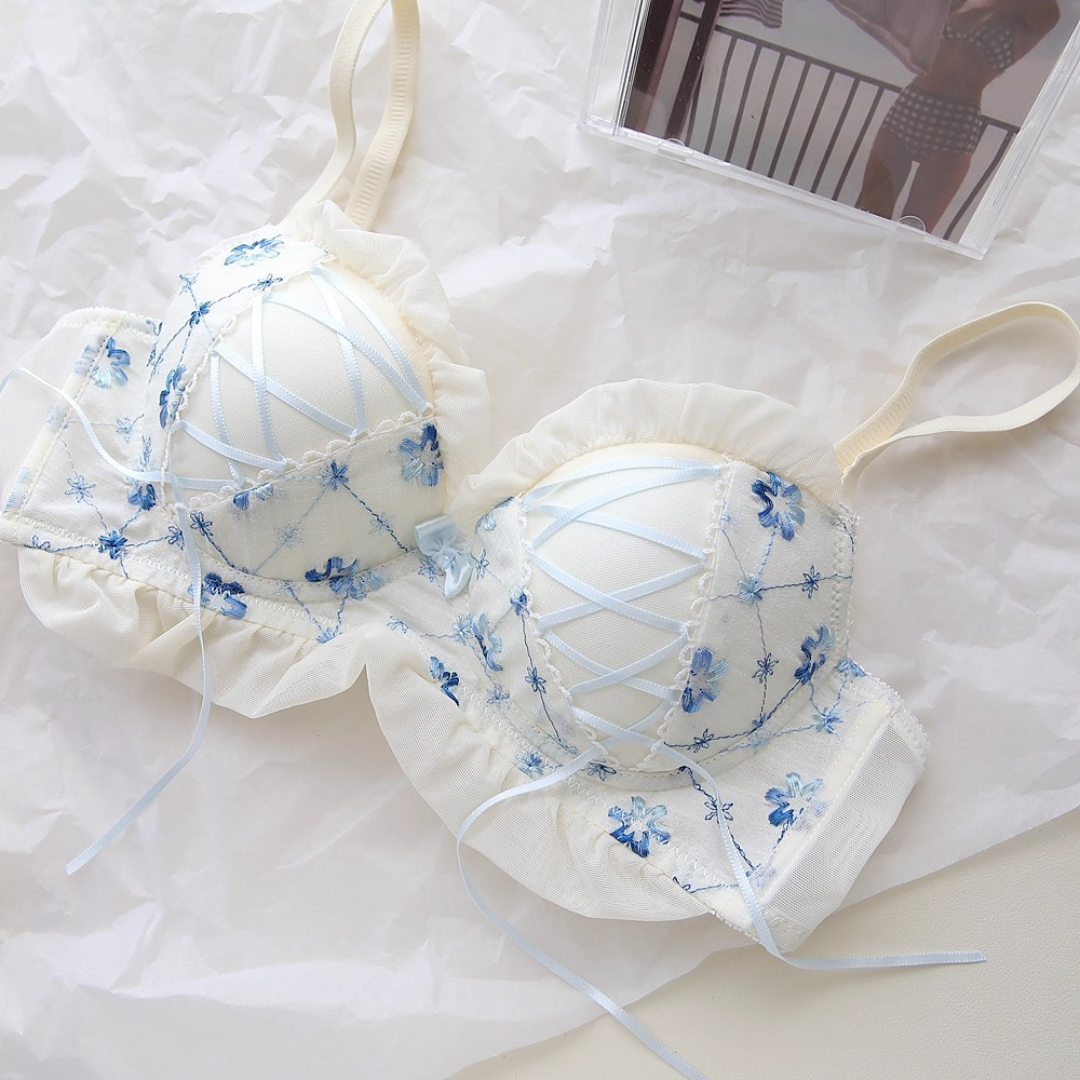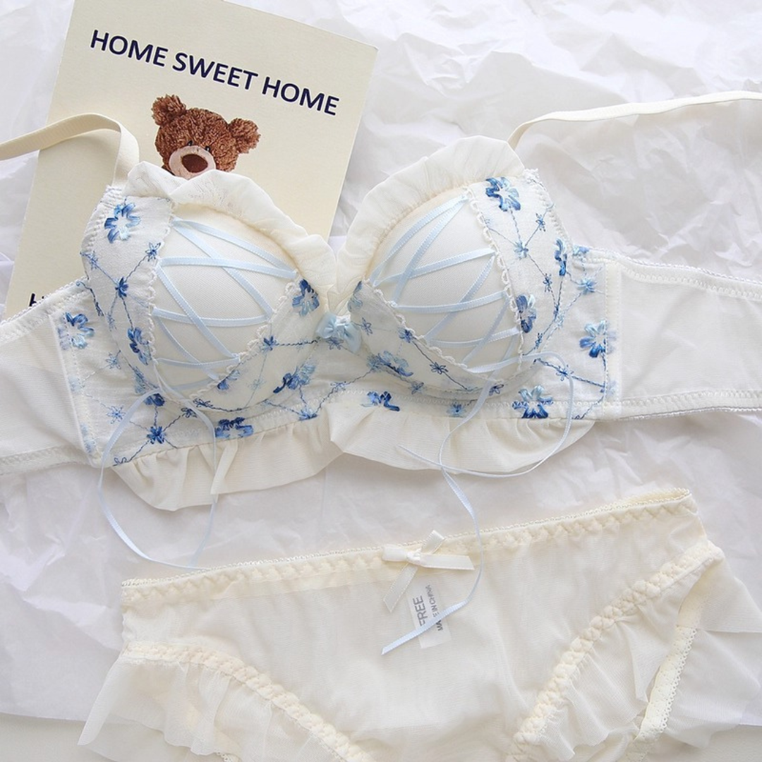 やさしい色合いと繊細な花刺繍が乙女心をくすぐるブラ&ショーツセット。ふんわりしたチュールフリルと、クロスリボンのアクセントがポイント!おうちでもお出かけ前でも、気分を上げてくれるスウィートデザインです。