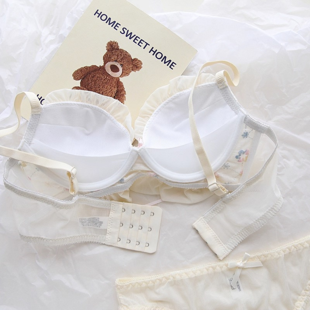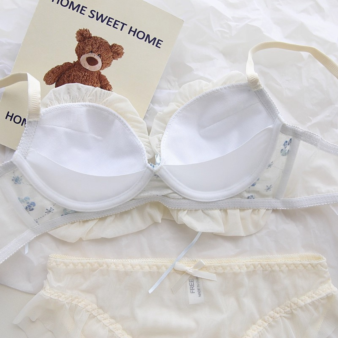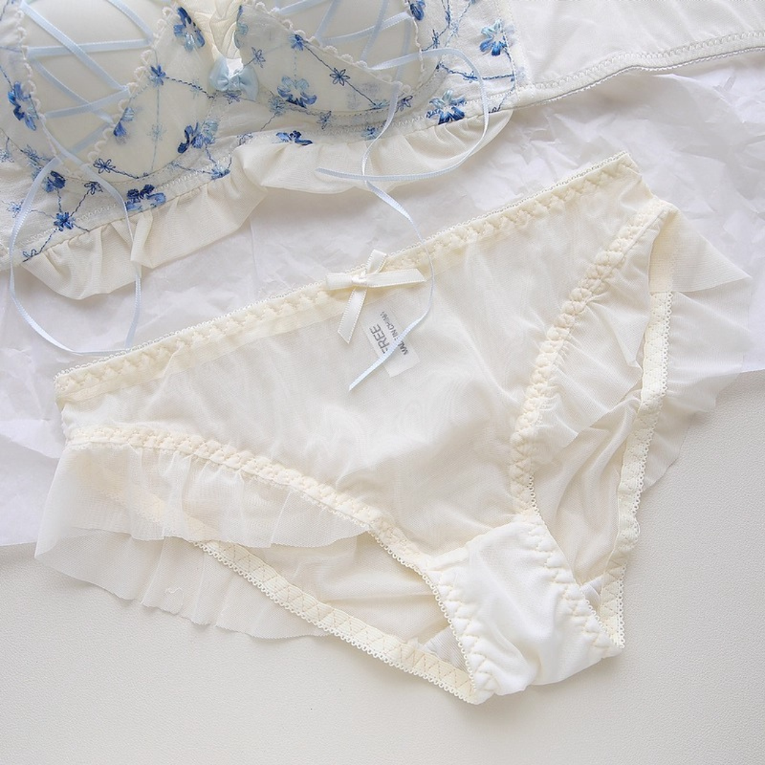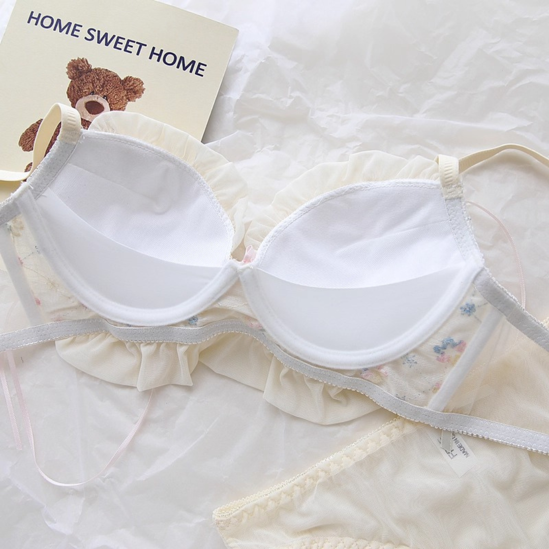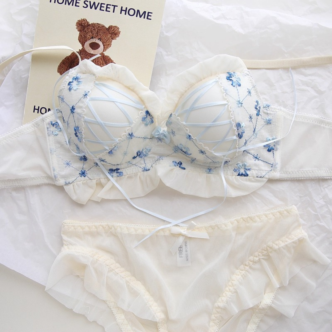 やさしい色合いと繊細な花刺繍が乙女心をくすぐるブラ&ショーツセット。ふんわりしたチュールフリルと、クロスリボンのアクセントがポイント!おうちでもお出かけ前でも、気分を上げてくれるスウィートデザインです。