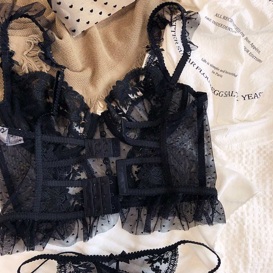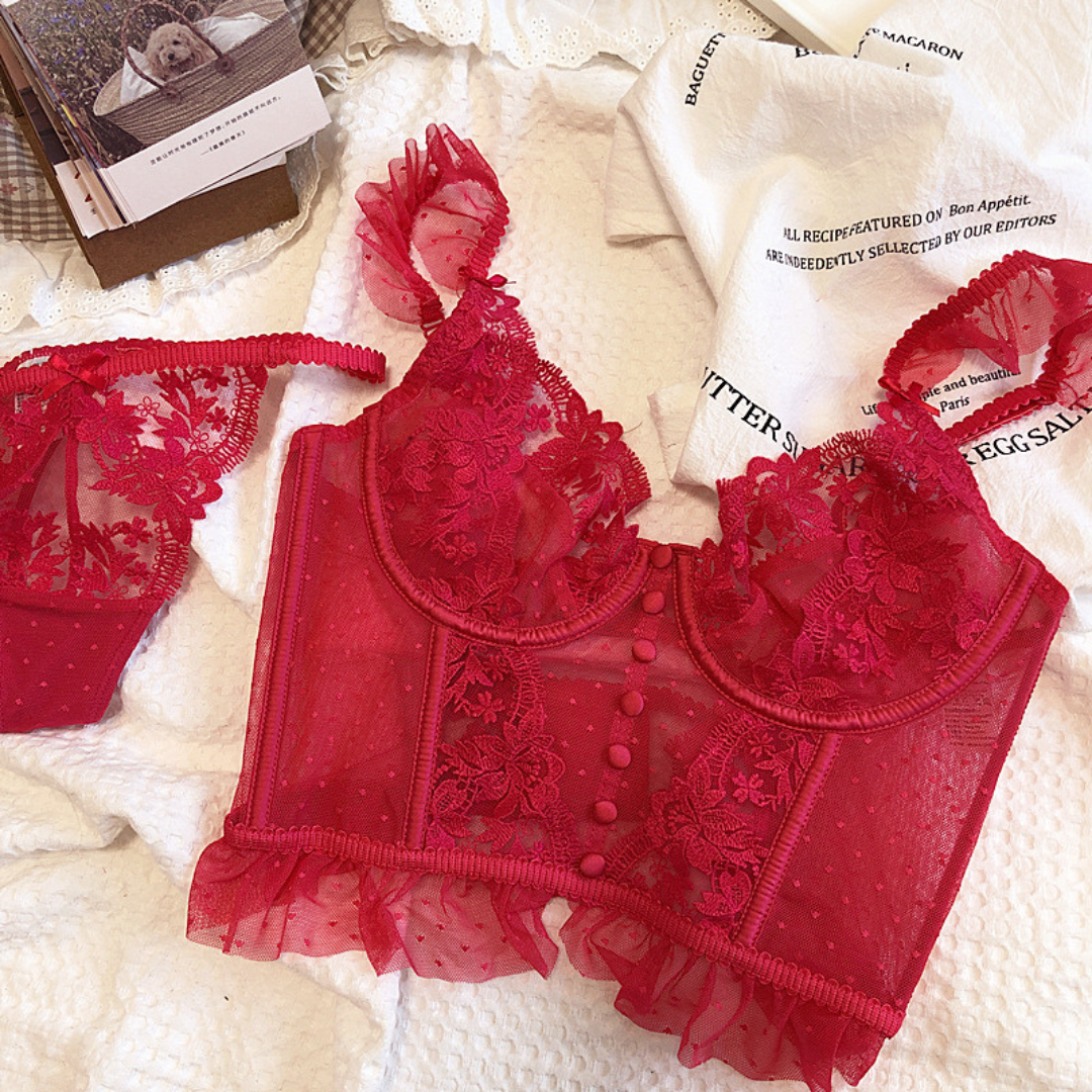 繊細な刺繍レースと透け感が絶妙なバランスの、フレンチセクシーなビスチェ型ランジェリー♡Tバックとのセットで360度どこから見ても美しく!