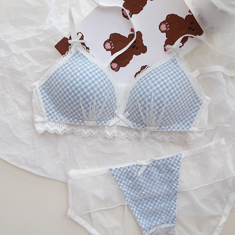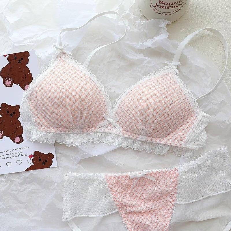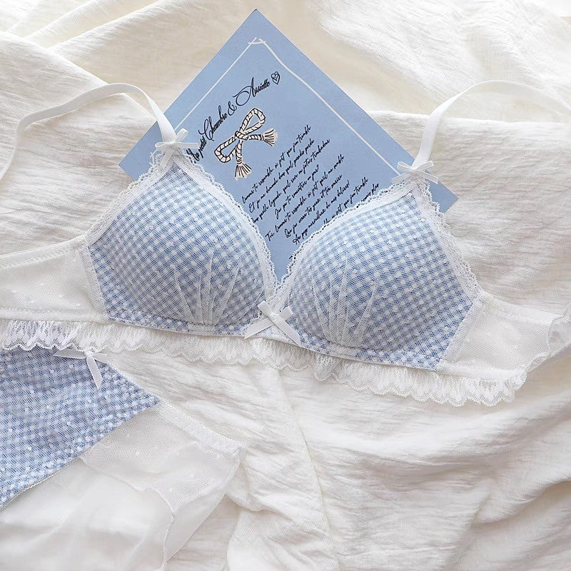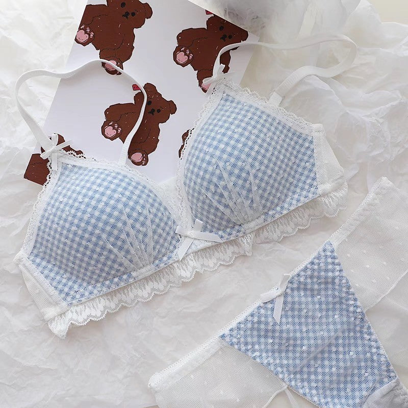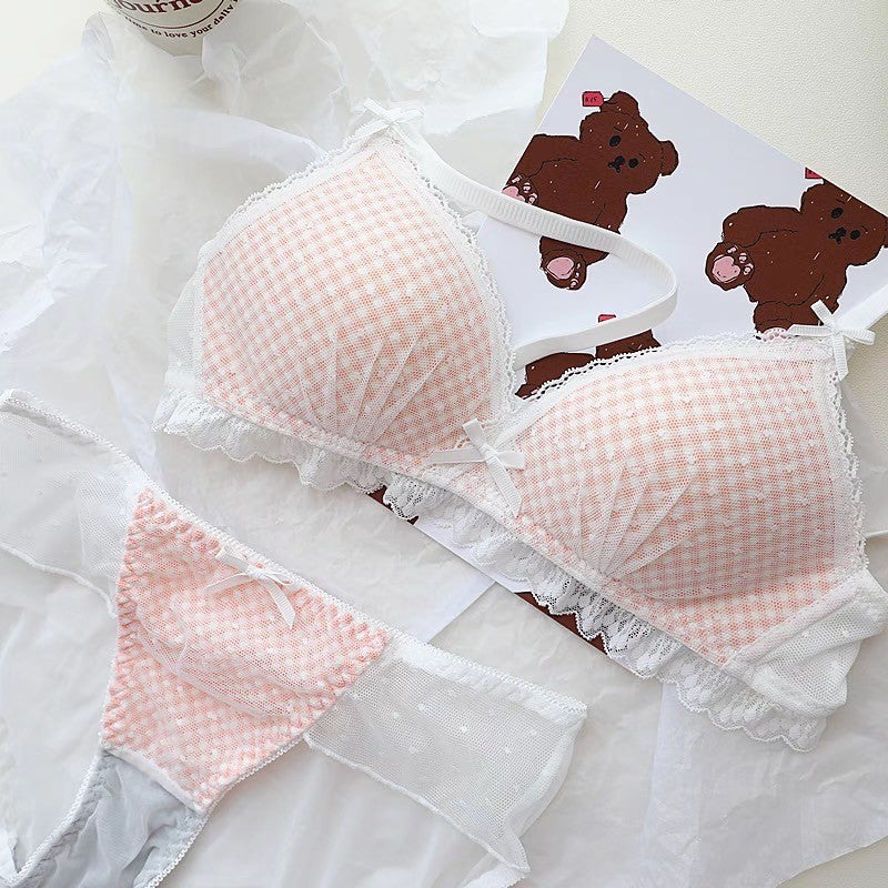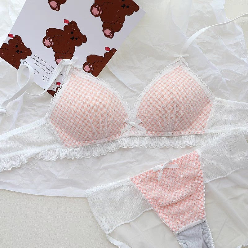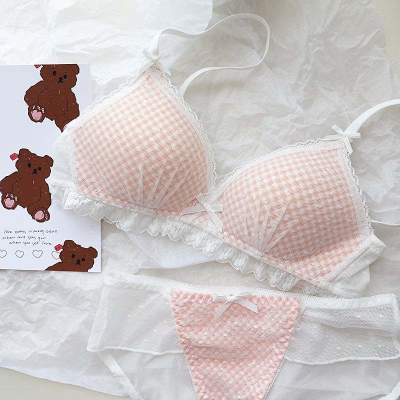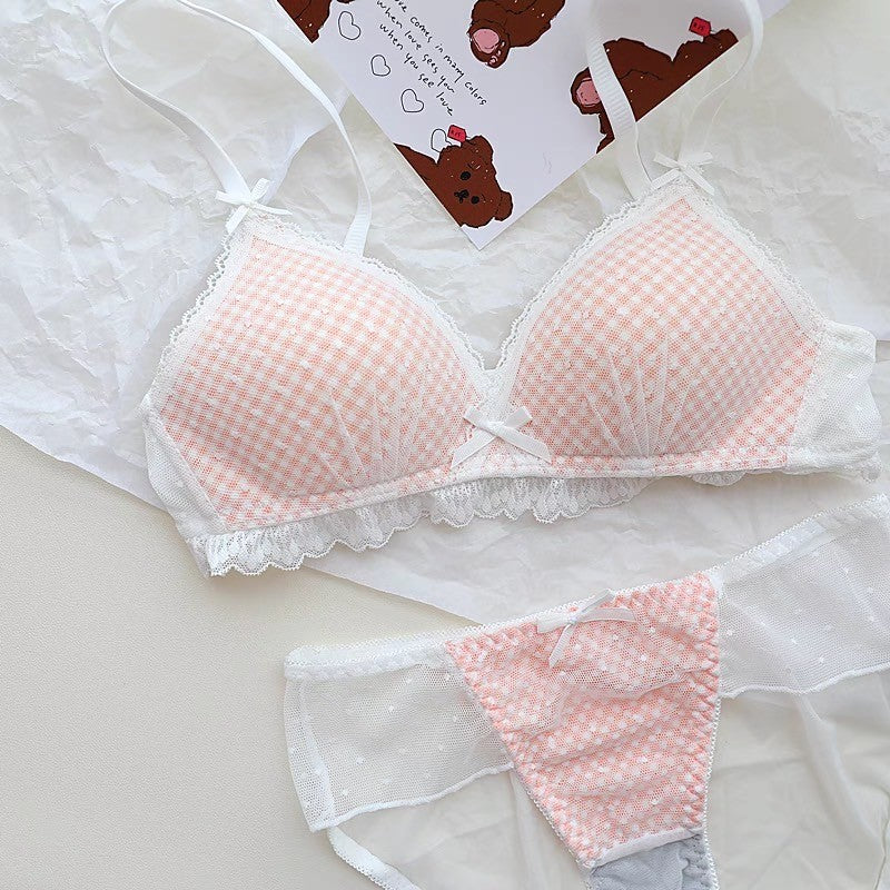 パステルカラーのギンガムチェックにふんわりとレースが重なった、キャンディみたいに甘い一着。お洋服にも響きにくいデザインで重宝すること間違いなしです。