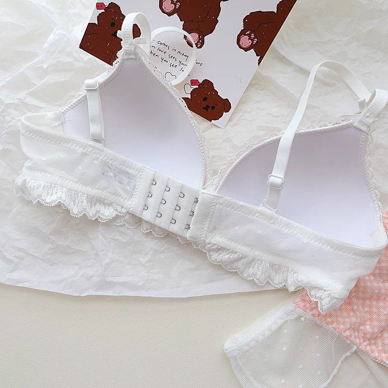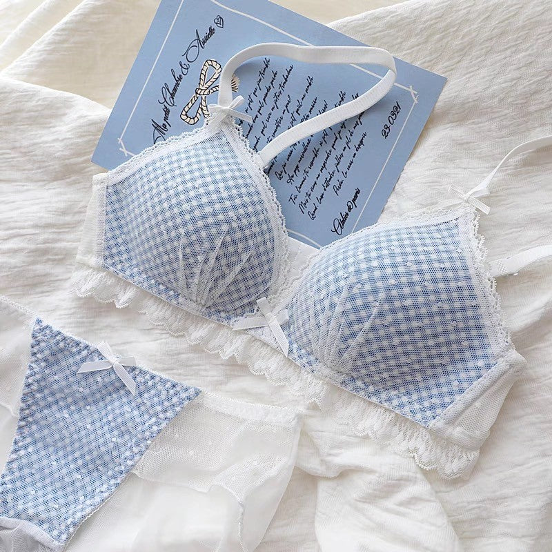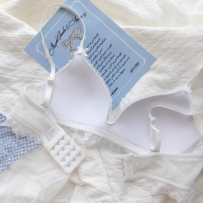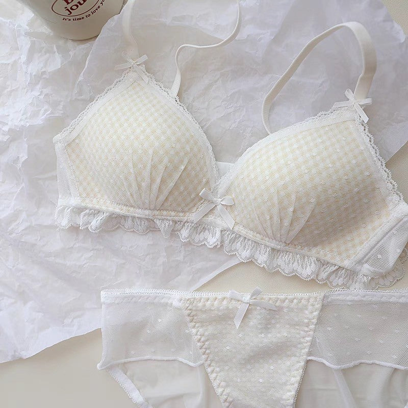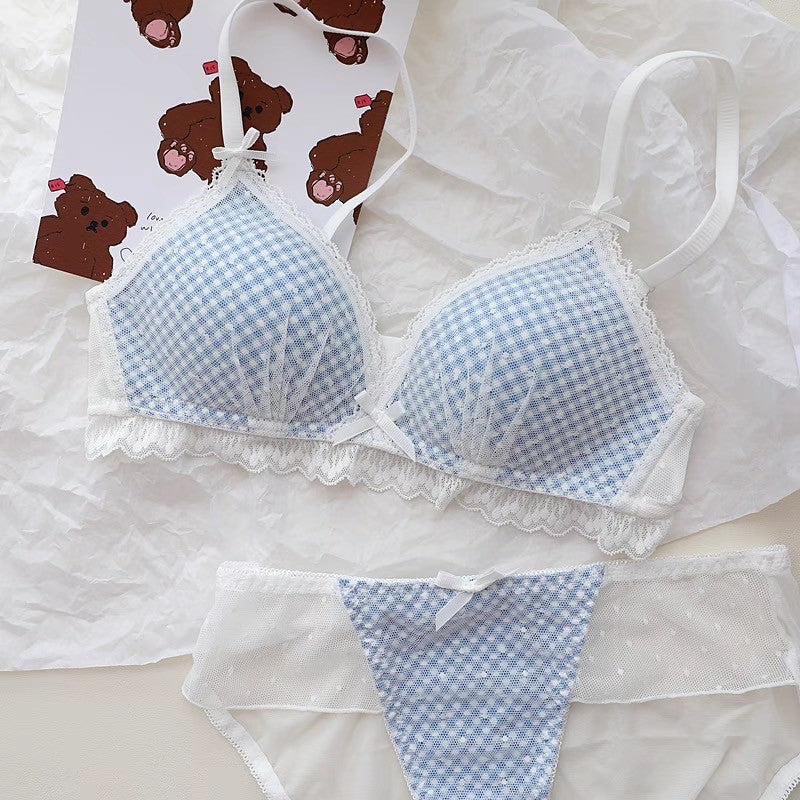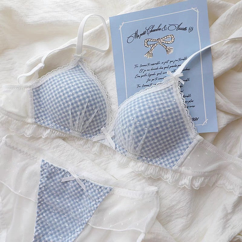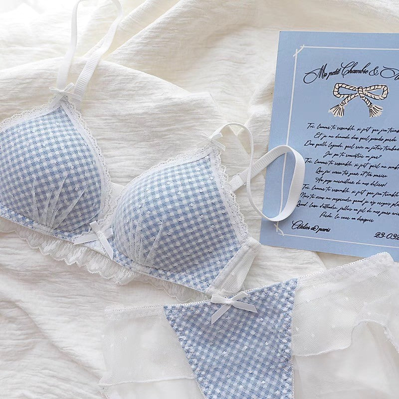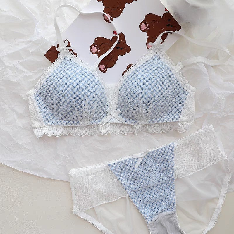 パステルカラーのギンガムチェックにふんわりとレースが重なった、キャンディみたいに甘い一着。お洋服にも響きにくいデザインで重宝すること間違いなしです。