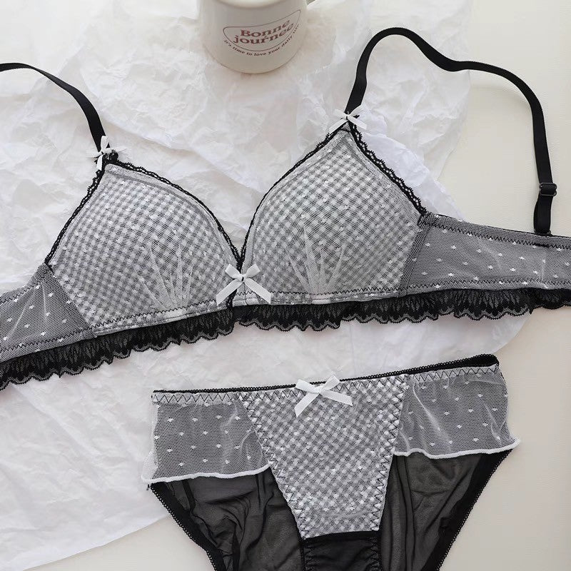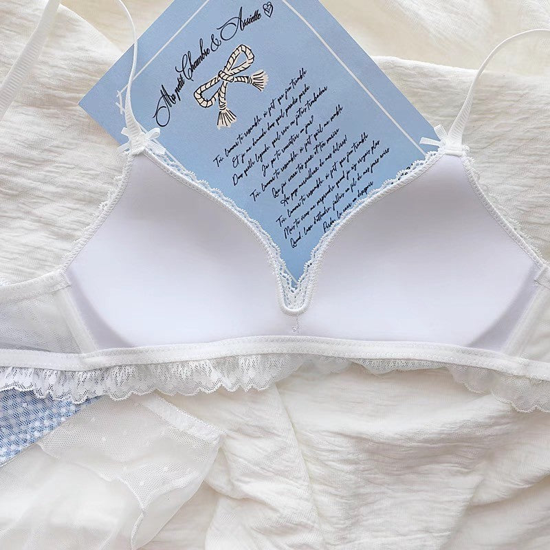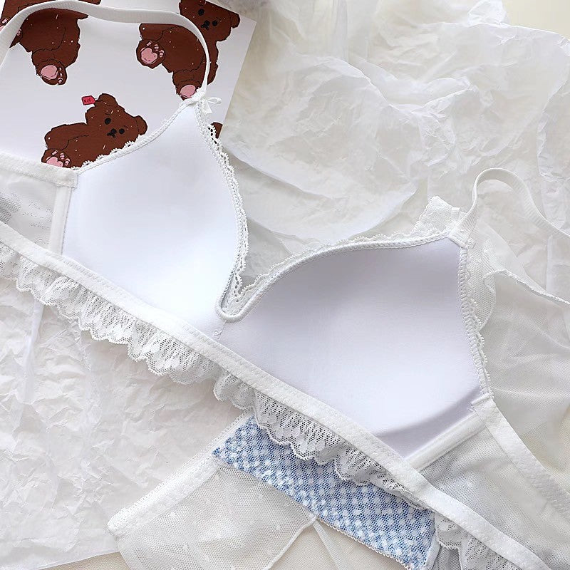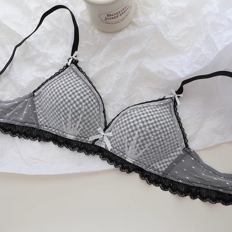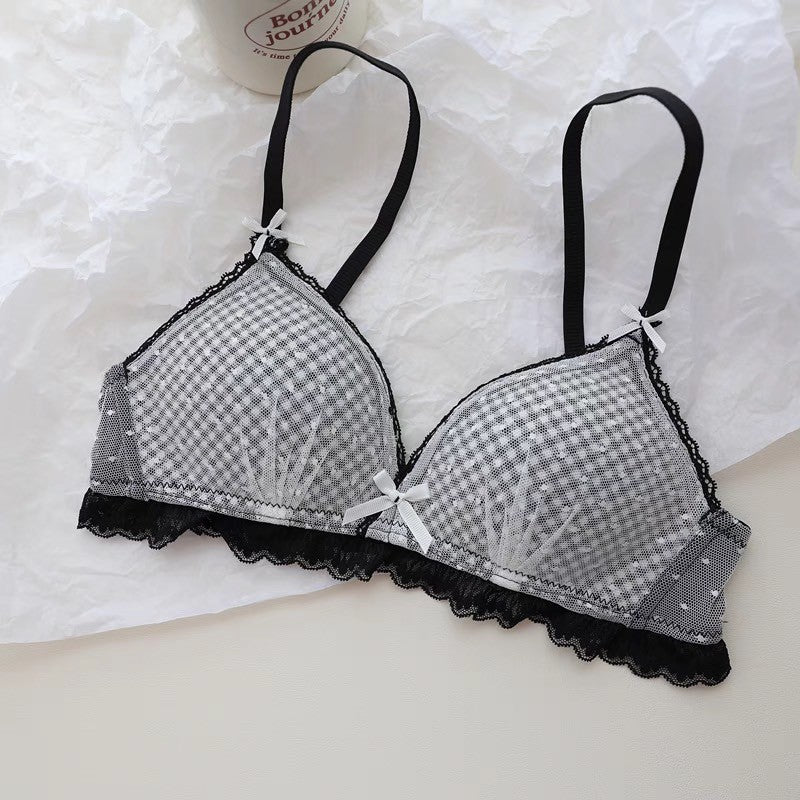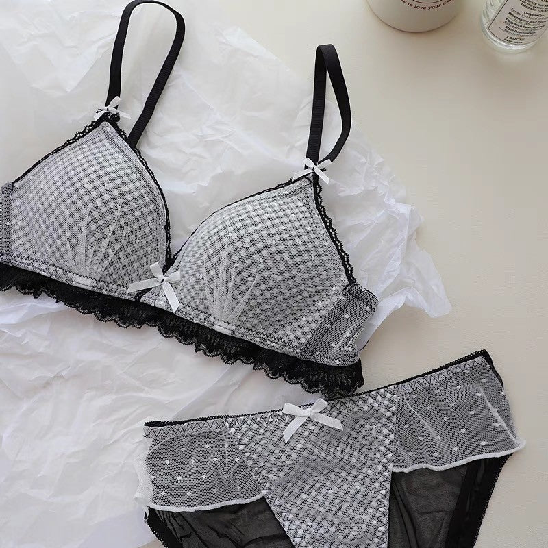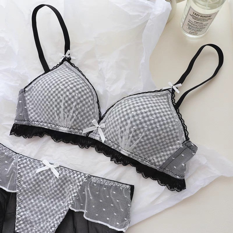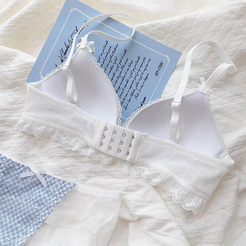 パステルカラーのギンガムチェックにふんわりとレースが重なった、キャンディみたいに甘い一着。お洋服にも響きにくいデザインで重宝すること間違いなしです。