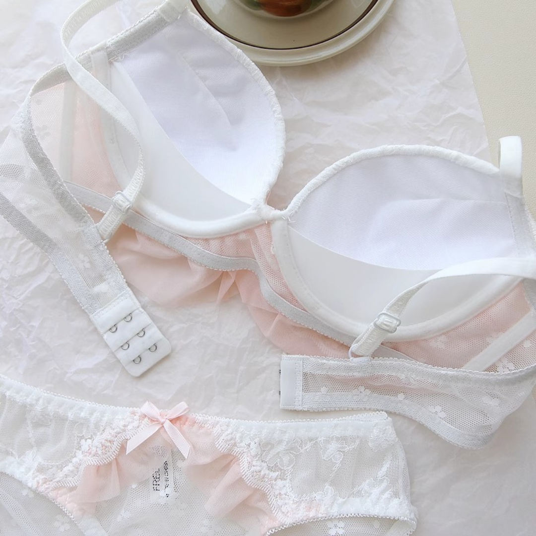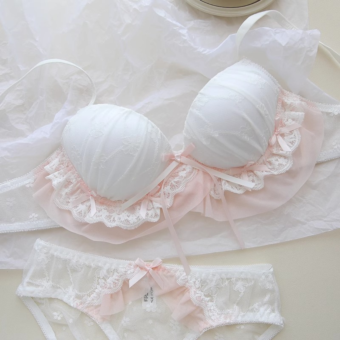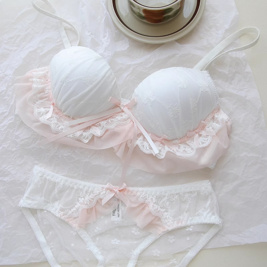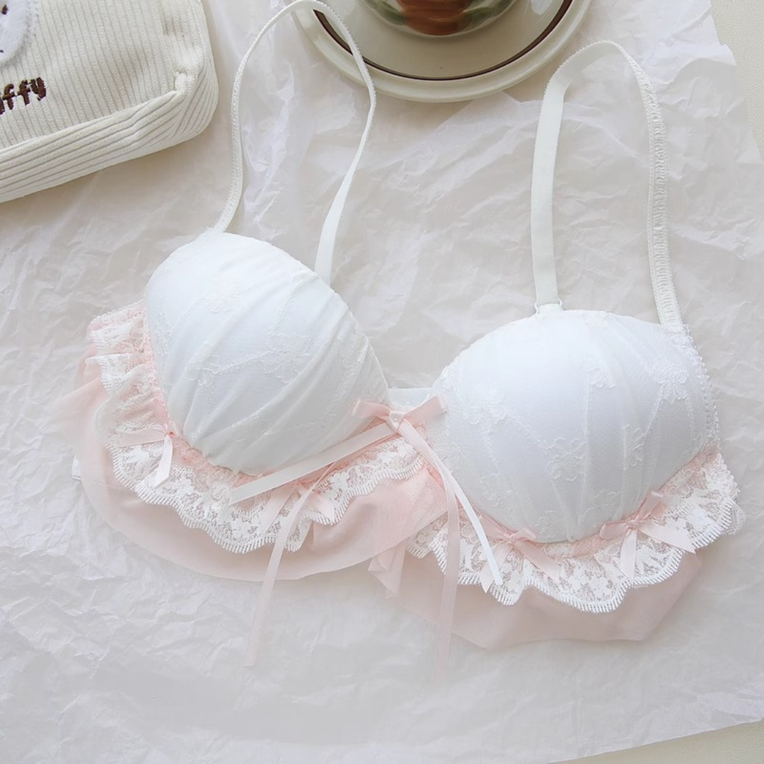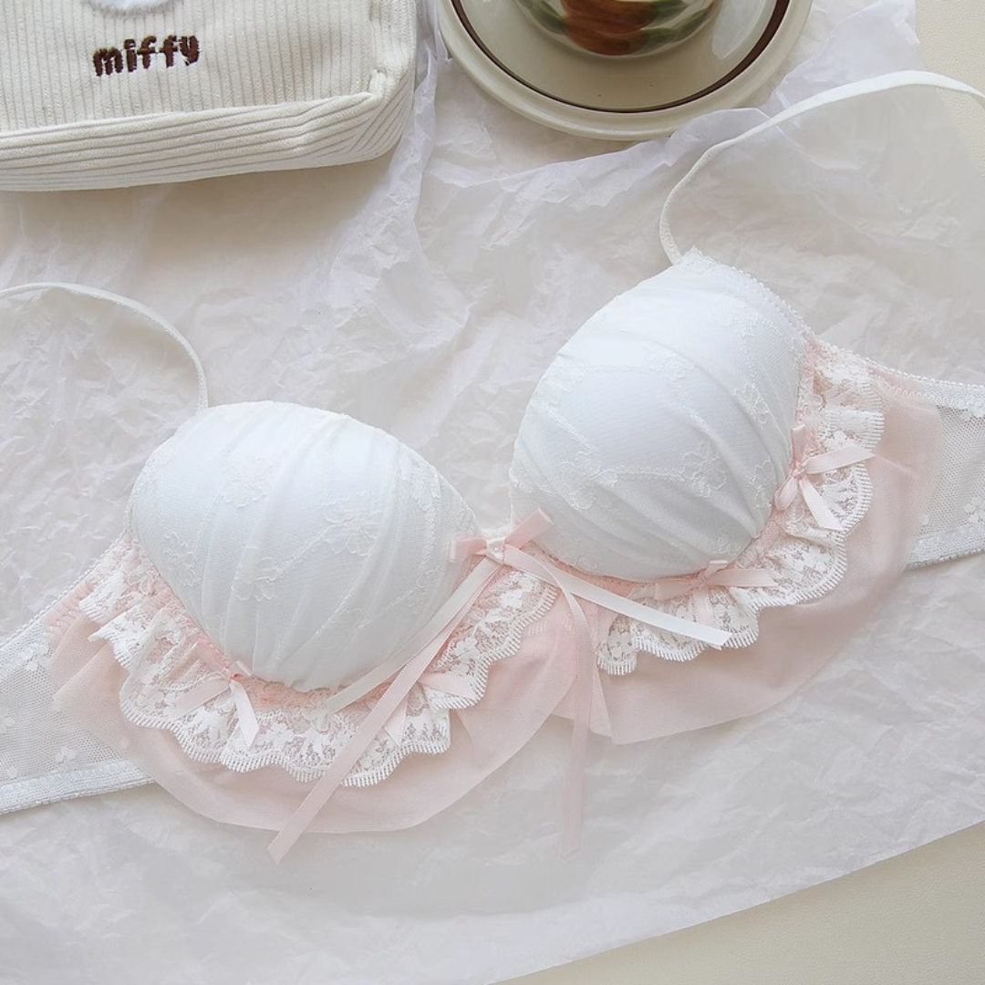 淡いピンクとホワイトの組み合わせが肌をふんわり引き立て、フリルとレースの立体感が◎しっかり美胸キープで小胸さんにもおすすめの一枚。