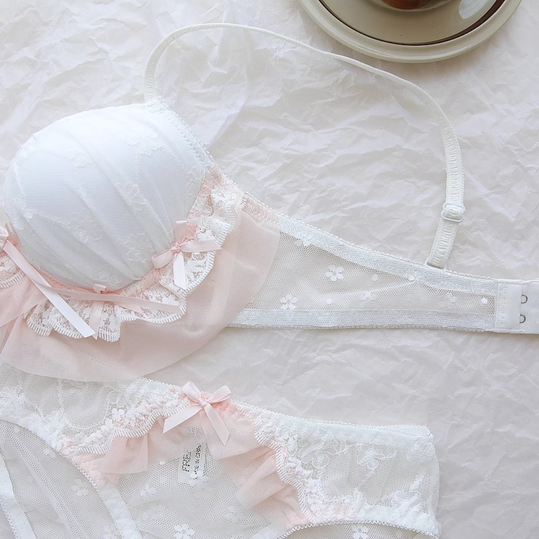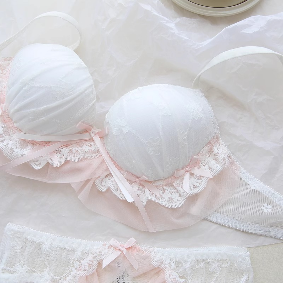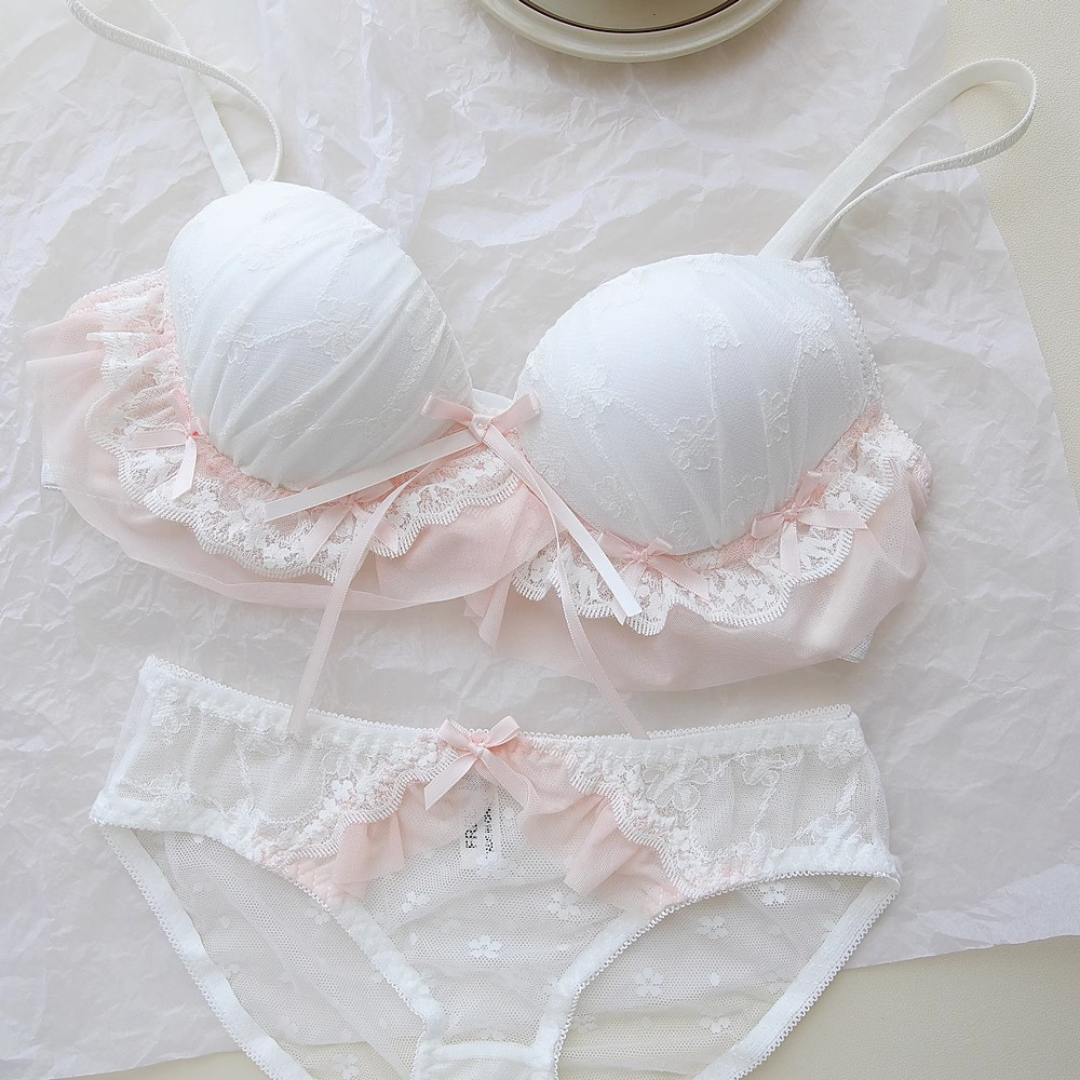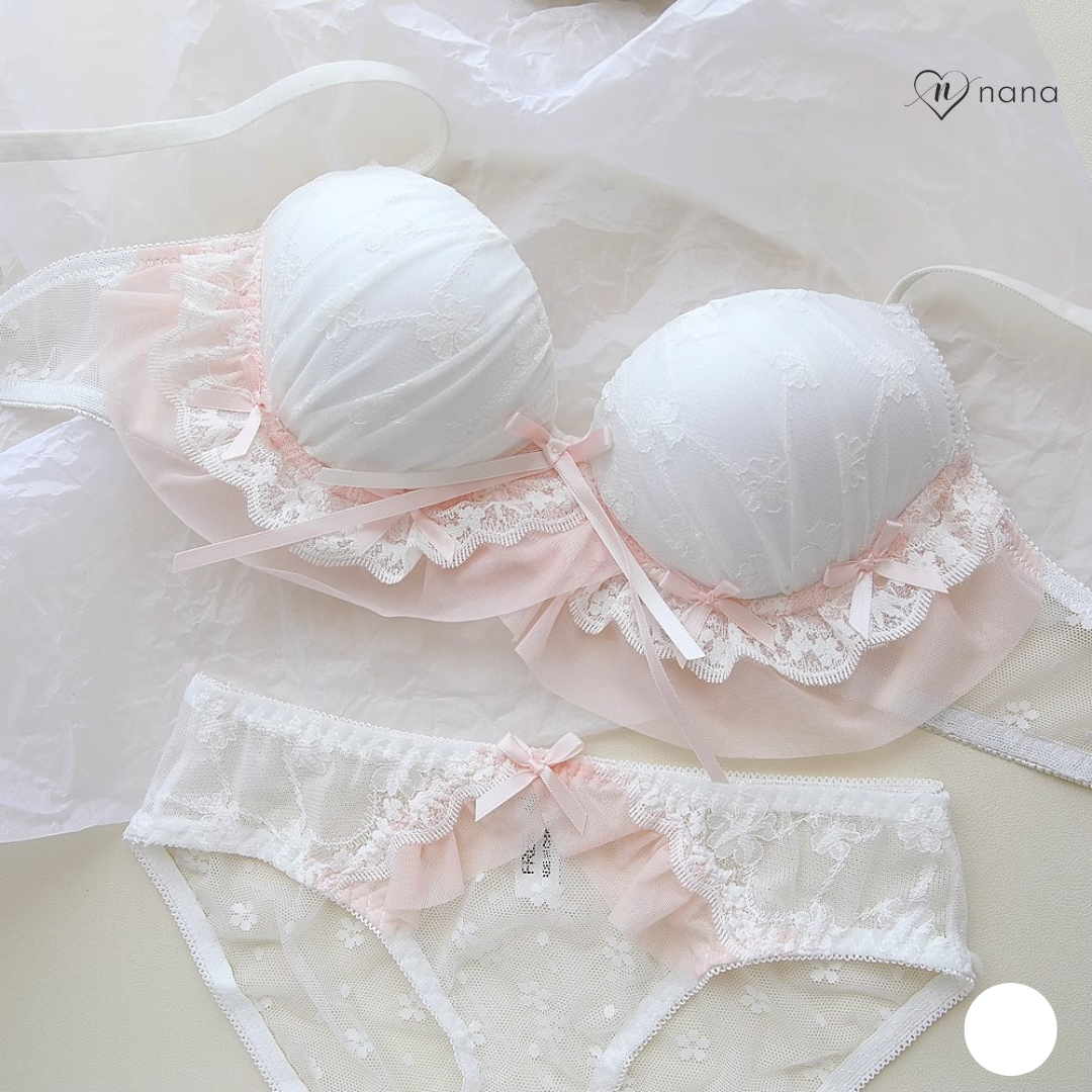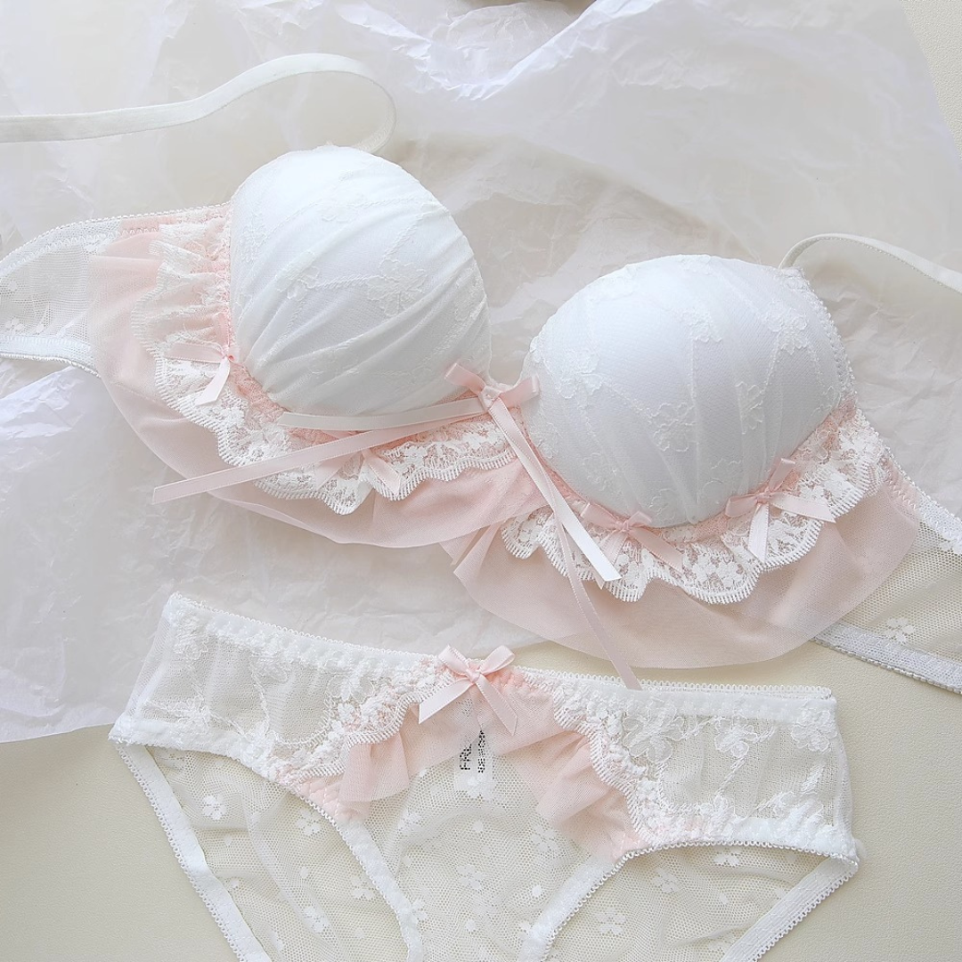 淡いピンクとホワイトの組み合わせが肌をふんわり引き立て、フリルとレースの立体感が◎しっかり美胸キープで小胸さんにもおすすめの一枚。