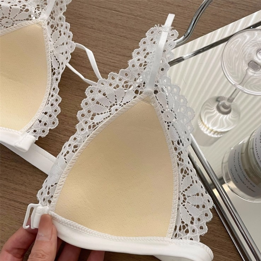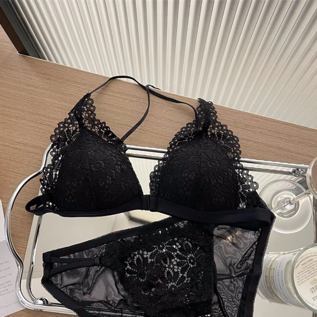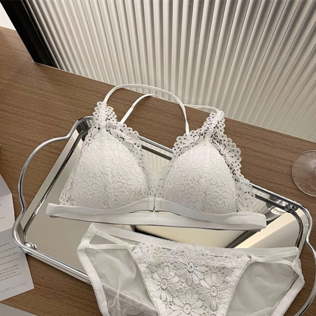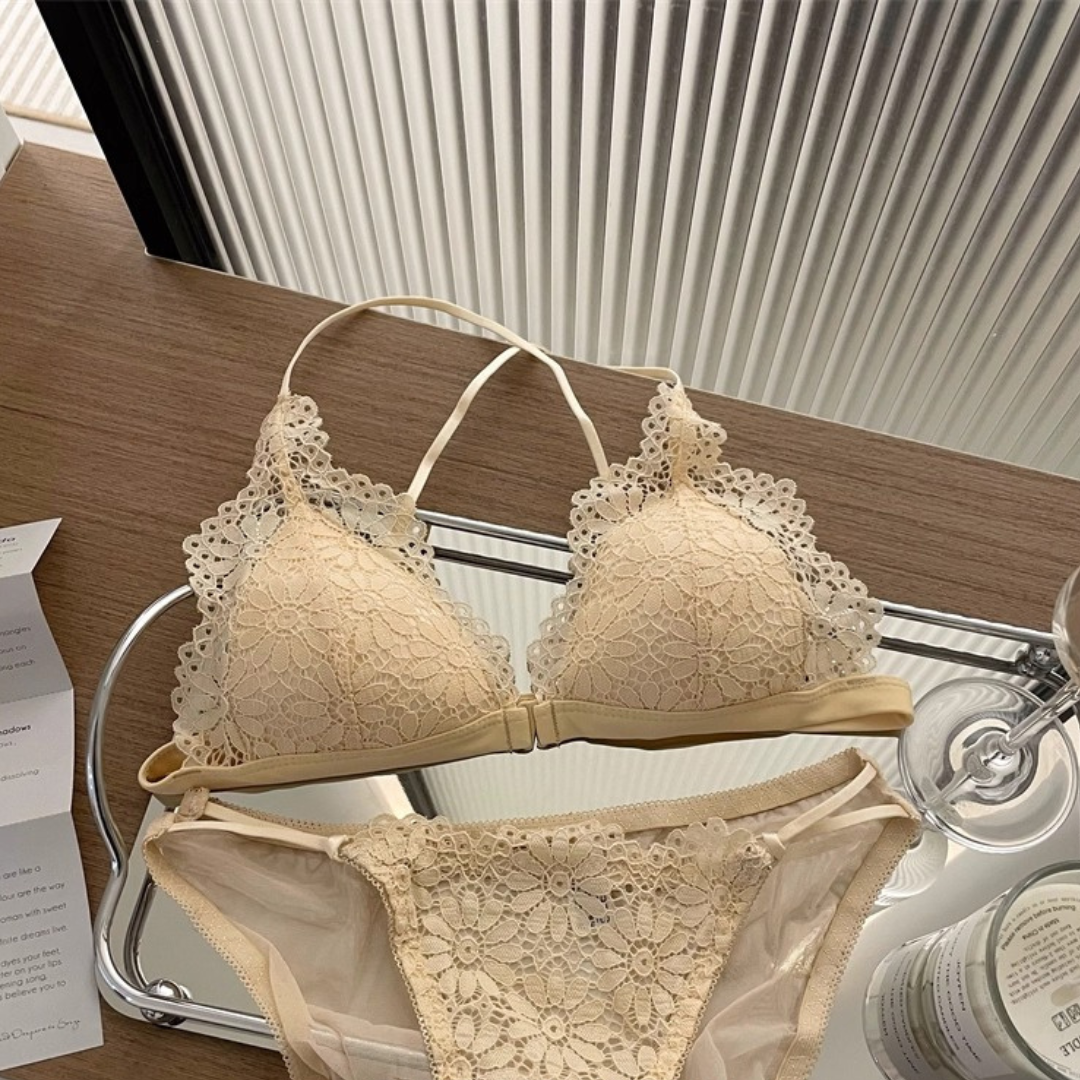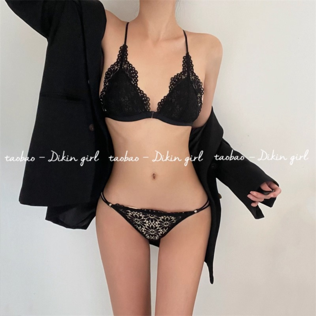 【10/9新作】フラワーレース三角カップブラレット&ショーツセット(全3色)0201NA1025:前ホック 薄型三角カップ クロスストラップ